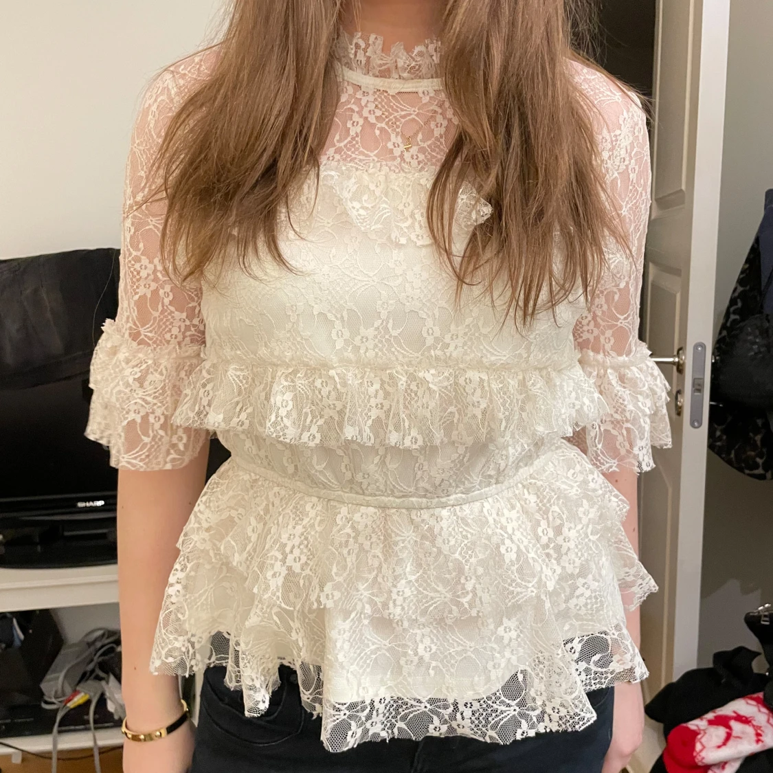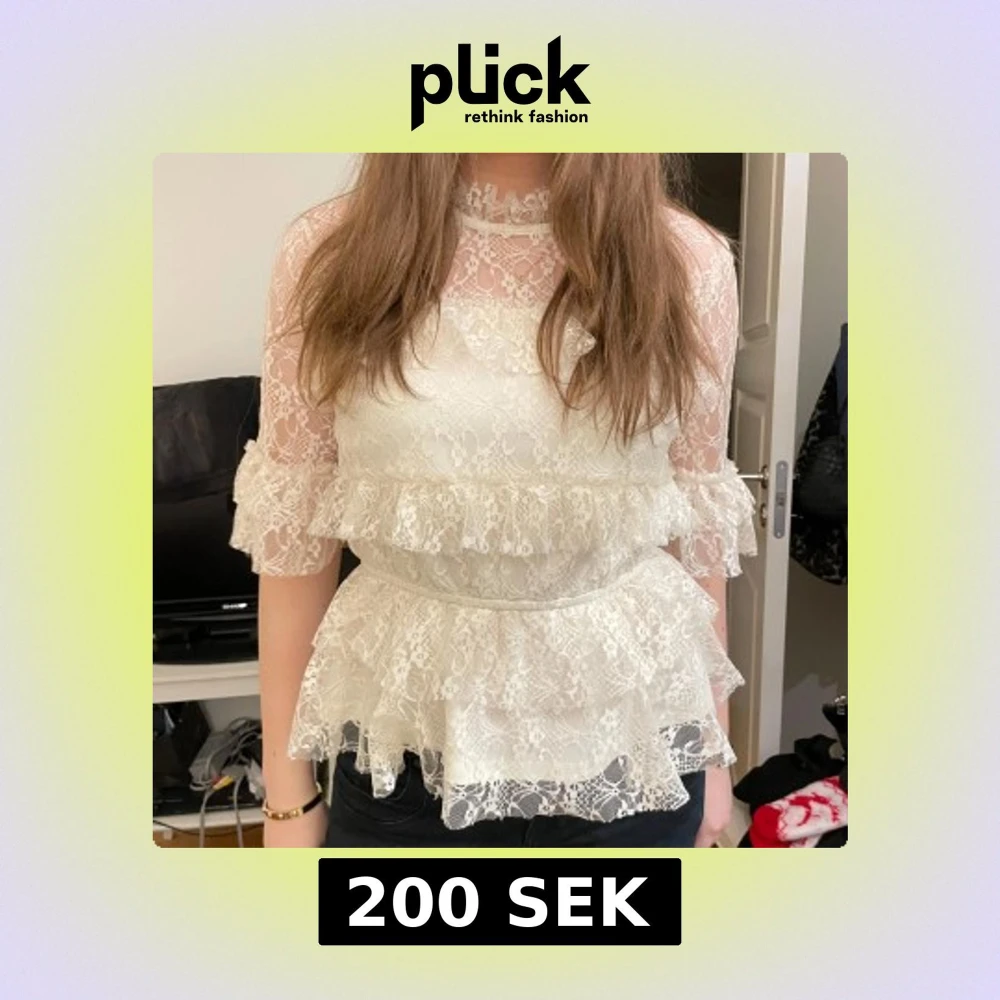 Elegant vit blus i spets med volanger och trekvartsärm. Perfekt för en stilfull look.