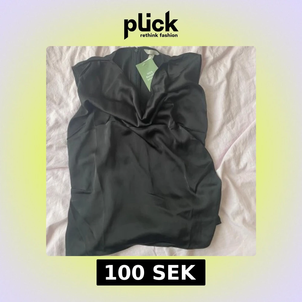Snygg svart blus i glansigt satinmaterial. Blusen har en draperad v-ringad front och är ärmlös för en clean look. Perfekt att styla med jeans eller kjol. Stängs med dragkedja bak. Aldrig använd prislapp kvar.