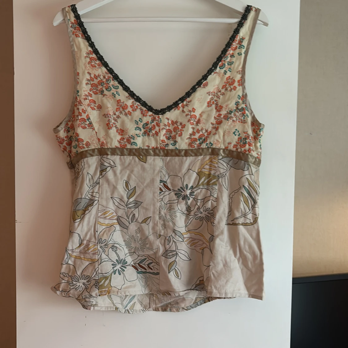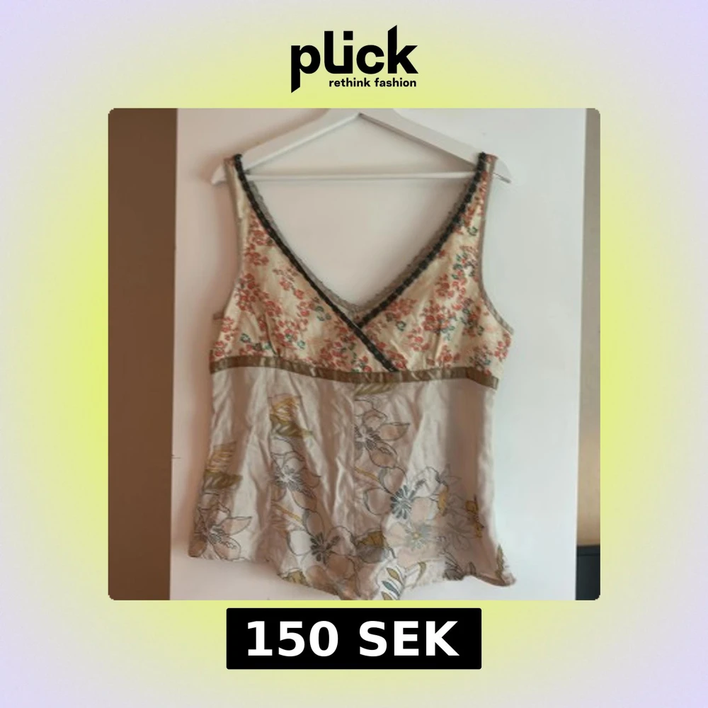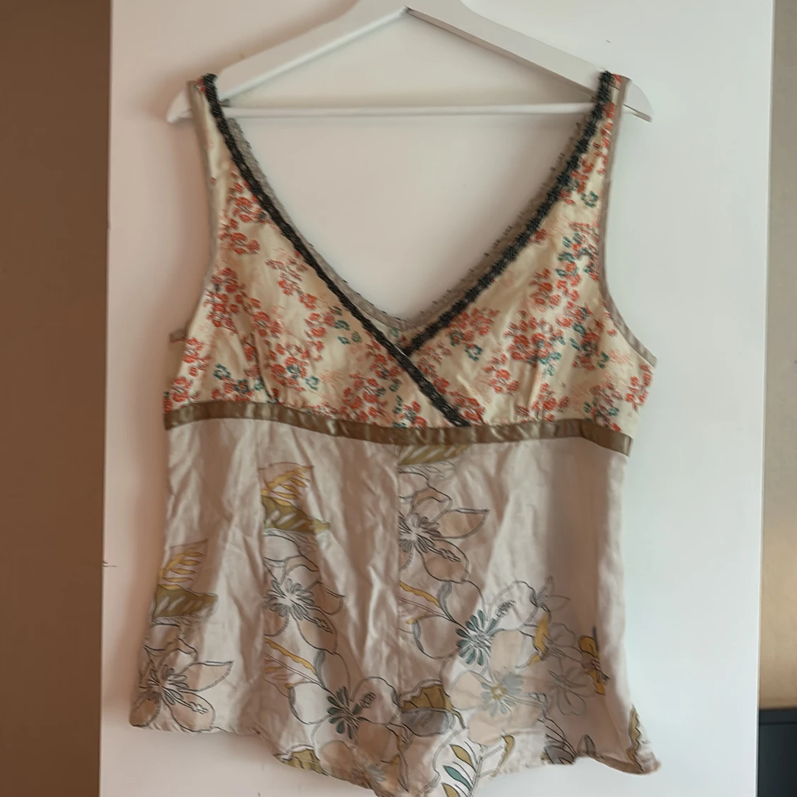 Söt linnetopp i ljusa toner med blommigt mönster i rött, grönt och beige. Toppen har omlott-v-ringning med svart spetskant och breda axelband. Nedre delen har stora blommor i dova färger och en dekorativ banddetalj i midjan. Perfekt för en somrig look!