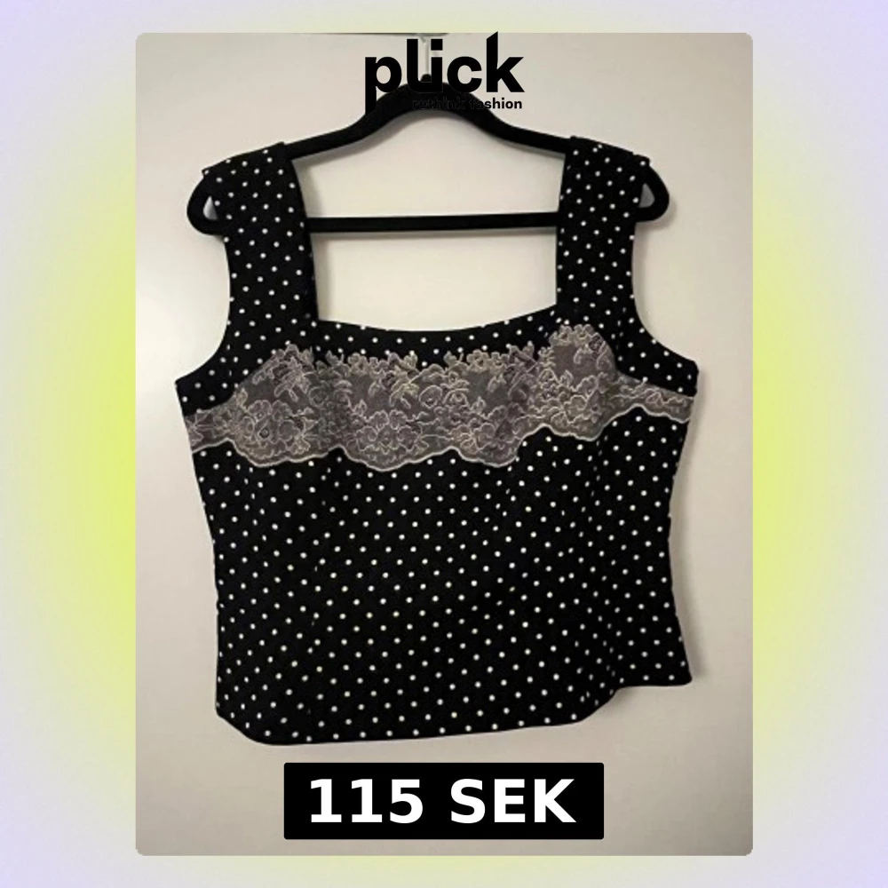 Supersöt svart blus från H&M med vita prickar och breda axelband. Framsidan har en bred spetsdetalj i vitt med blommigt mönster som ger en extra touch. Blusen har fyrkantig urringning och är lätt figursydd för en snygg siluett.