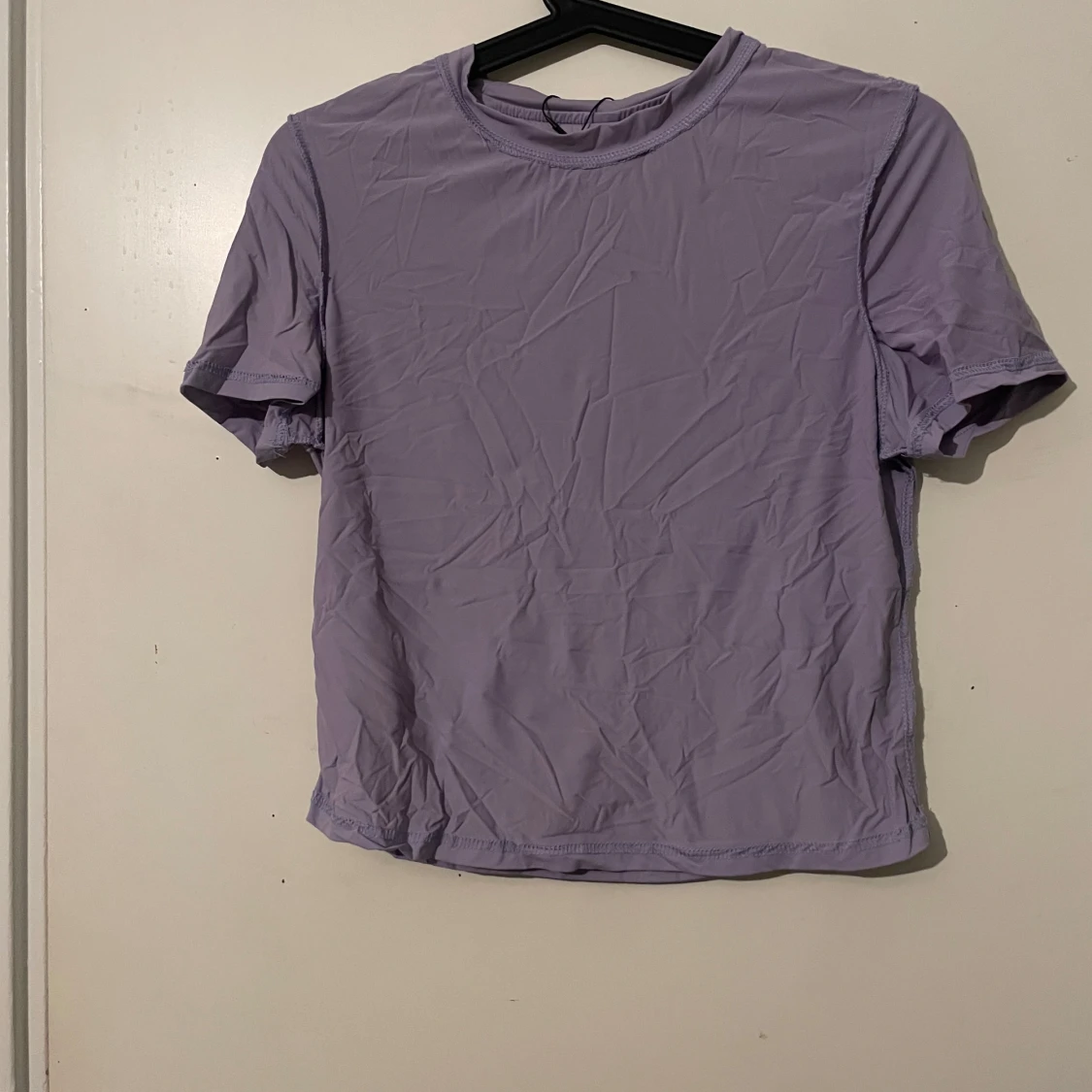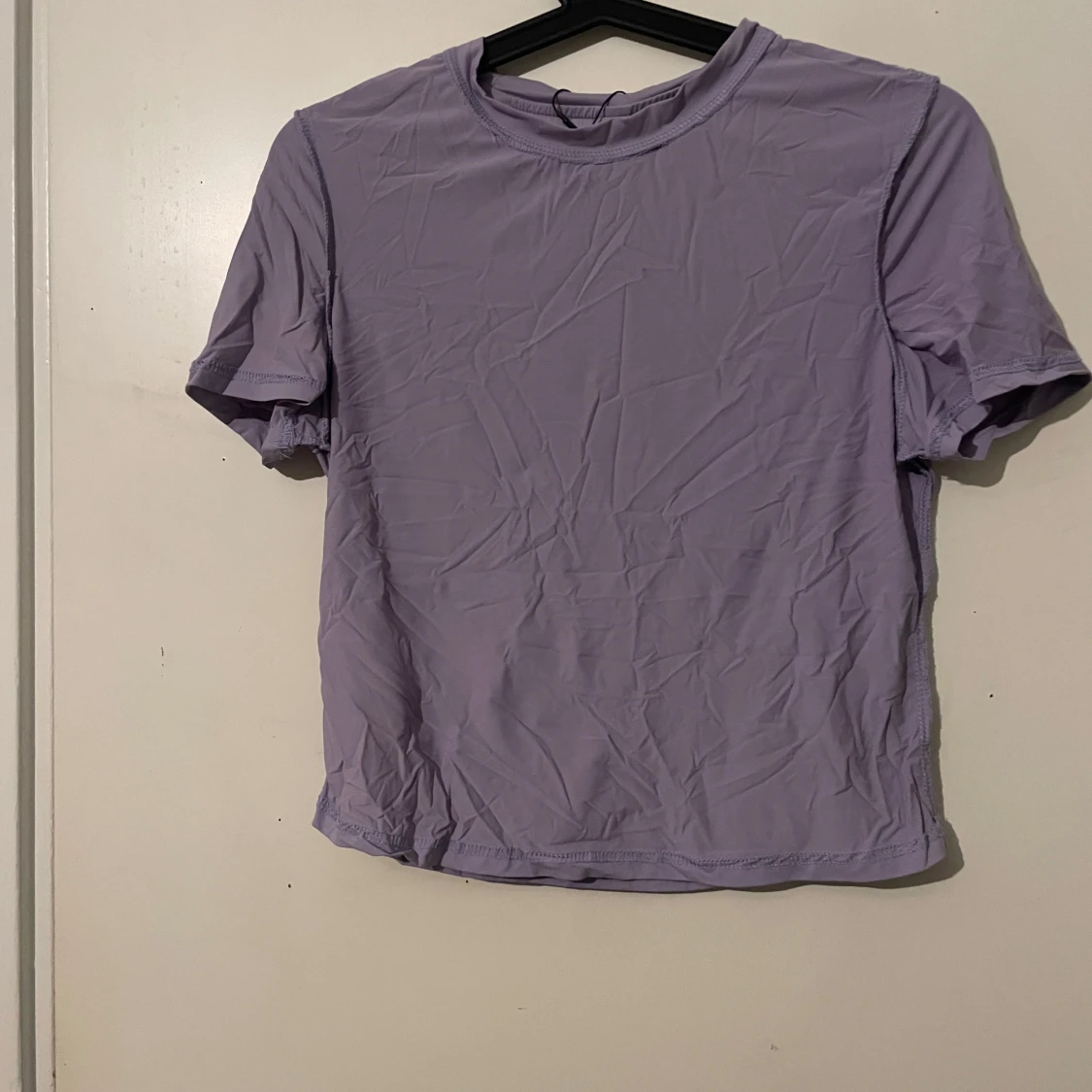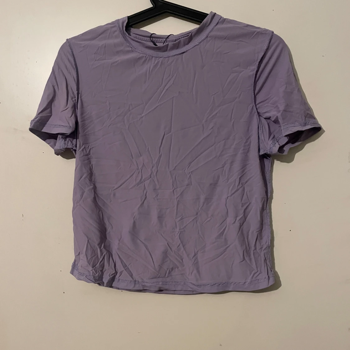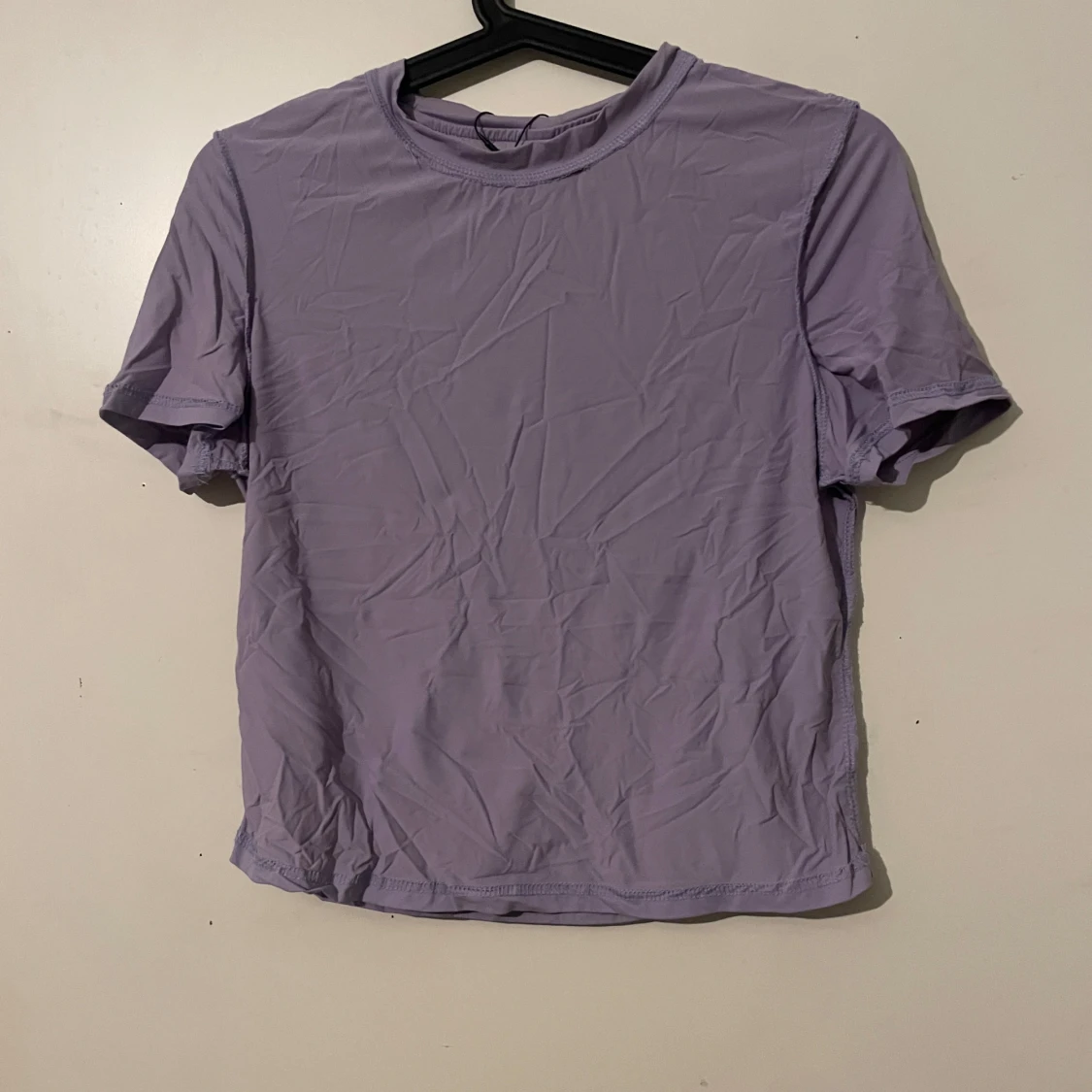 Säljer en enkel och stilren lila kortärmad topp. Perfekt för en avslappnad look. Toppen har en rund halsringning och är gjord i ett mjukt material.