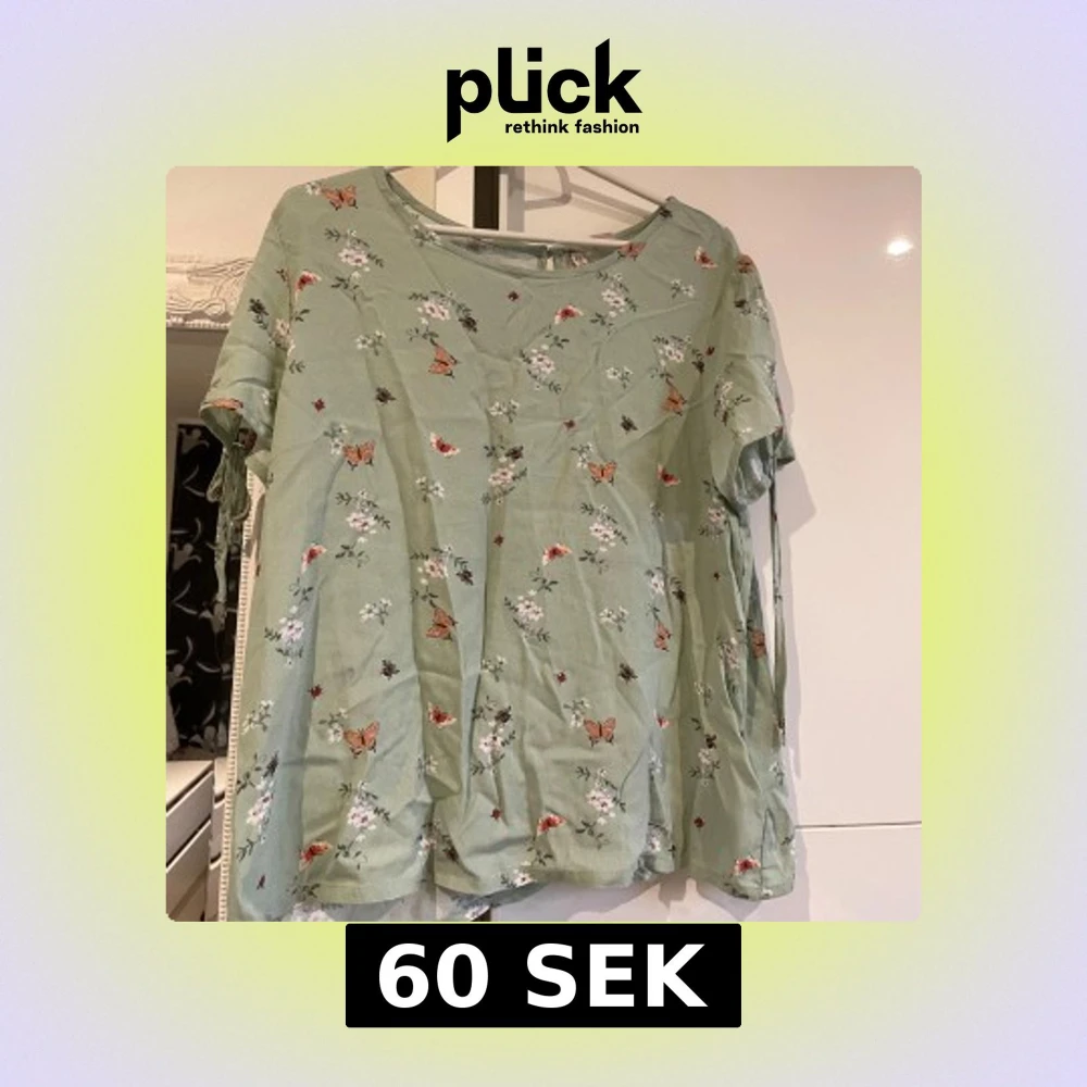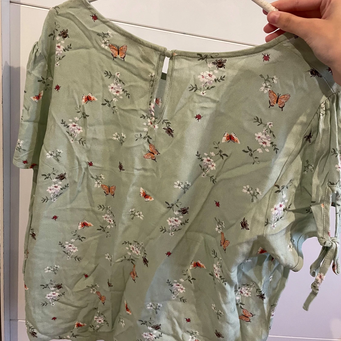 Supersöt ljusgrön blus med kort ärm och knytband på sidorna. Blusen har ett blommigt mönster med små fjärilar och blommor i vitt, orange och rosa. Passar även dem som har M i storlek.