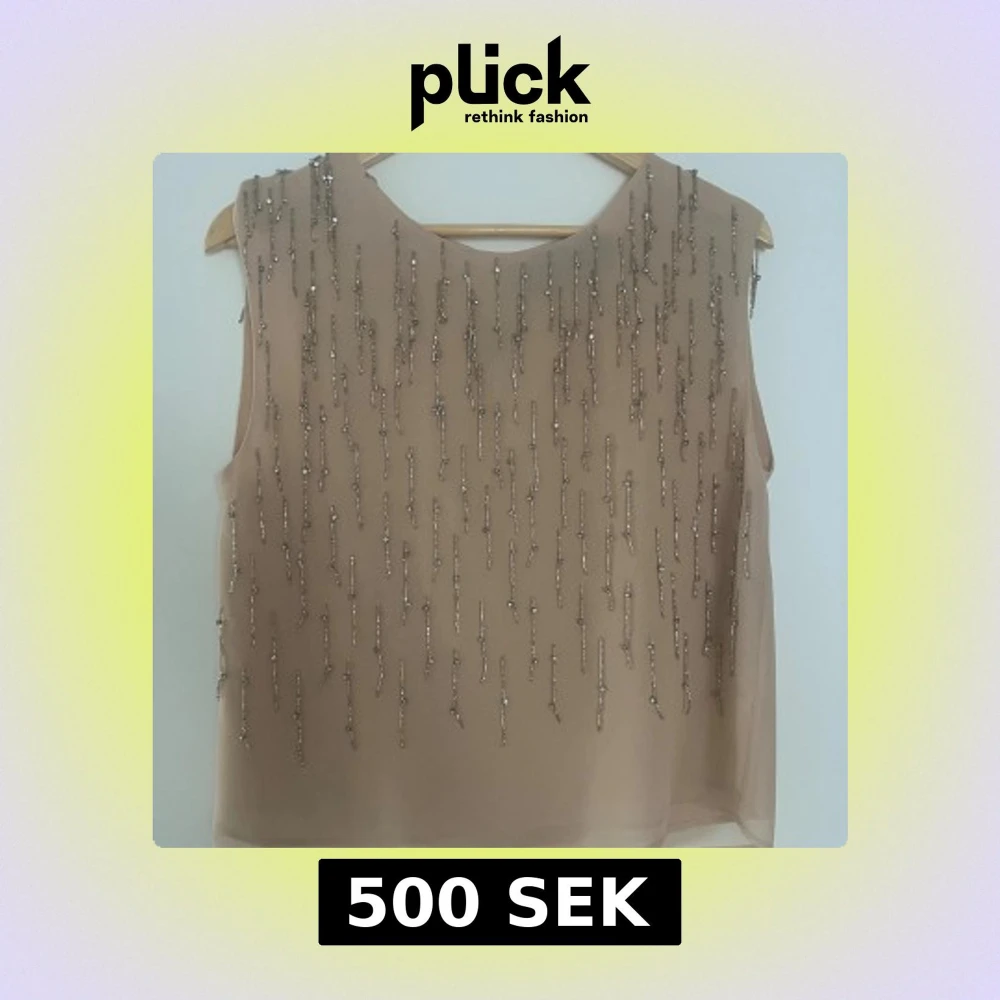 Säljer en beige blus från Patrizia Pepe i polyester med coola vertikala pärldetaljer och paljetter framtill. Blusen är ärmlös och har en rund hals samt knapp i nacken. Perfekt för dig som gillar glittriga detaljer och vill sticka ut lite extra.