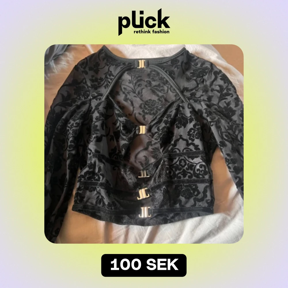 En elegant svart blus med spetsdetaljer och 4 dekorativa spännen framtill. Blusen har ett blommigt mönster och långa ärmar. Den är perfekt för festliga tillfällen. aldrig använd