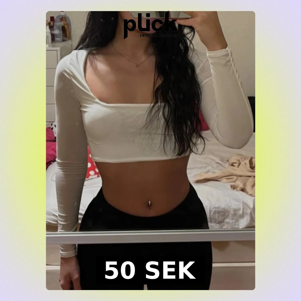 Säljer en stilren vit croppad topp med långa ärmar och fyrkantig ringning. Toppen har en tight passform och är perfekt att matcha med höga byxor eller kjol. Materialet känns mjukt och stretchigt, vilket gör den bekväm att bära.