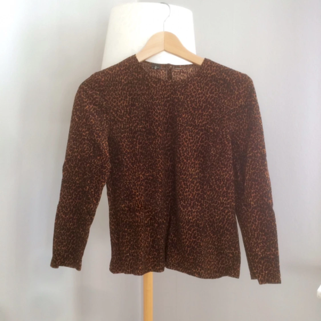 Leopardmönstrad tröja i kortare modell. Lite plysch-aktigt tyg, men absolut inte glansigt. Hög u-ringning.