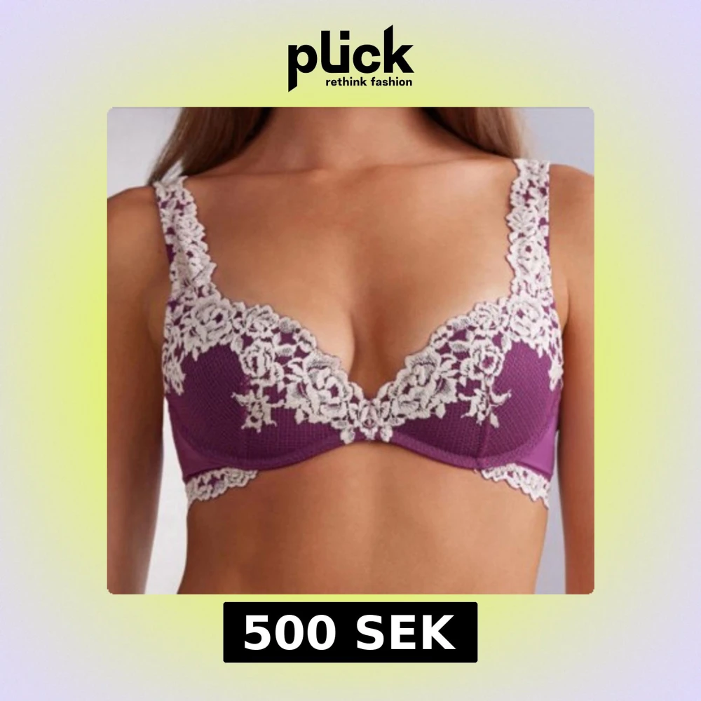 Superfin lila bh med breda axelband och vacker vit spets i blommigt mönster längs kanterna. Bh-n är i en lila röd färg med vit spets. Slutsåld och borttagen från hemsidan, sista chansen att köpa.