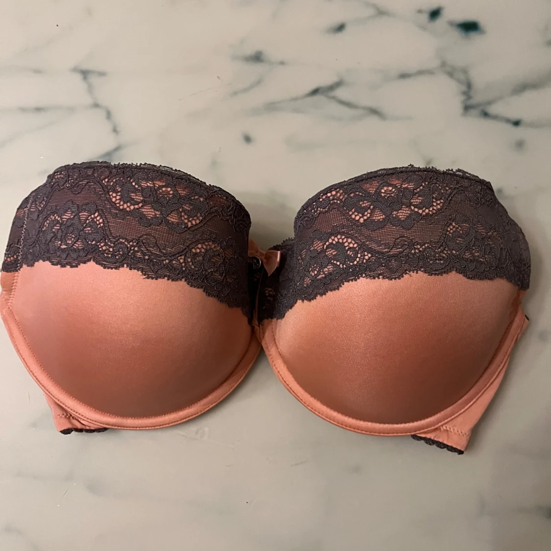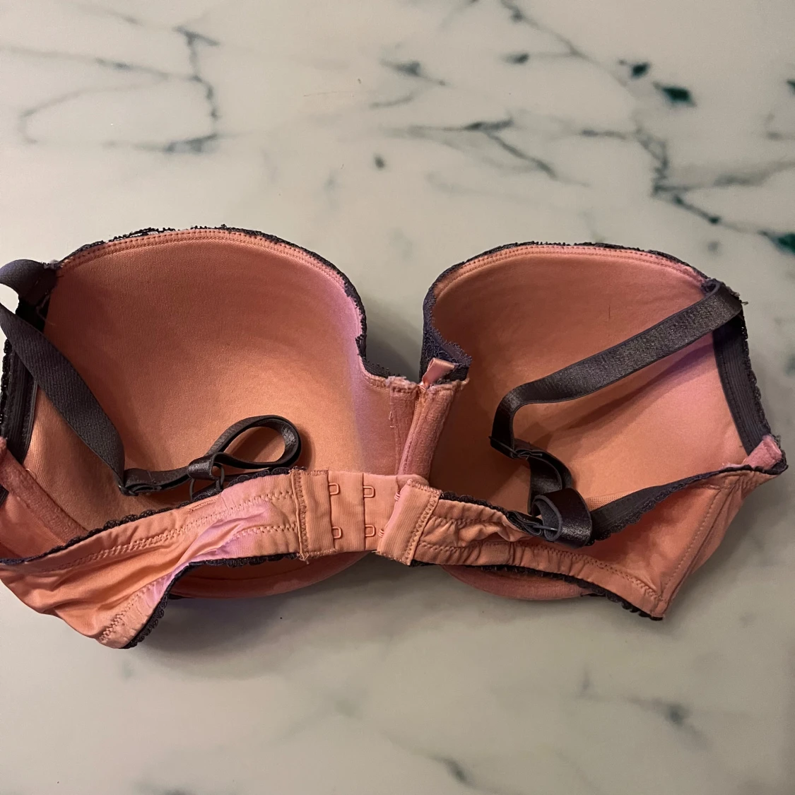Snygg rosa bh med svarta spetsdetaljer och vadderade kupor för extra stöd. Perfekt för att bära under klänningar eller toppar med bara axlar.