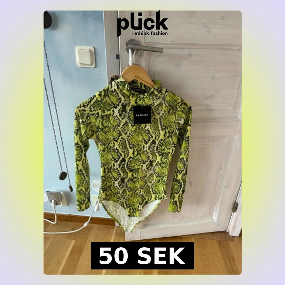 Säljer en cool långärmad bodysuit från Parisian med grön och svart ormmönster. Storleken lotsvarar s/m. Toppen har hög hals och är figurnära med stretchigt syntetmaterial. Perfekt för dig som vill sticka ut med ett edgy och trendigt plagg.