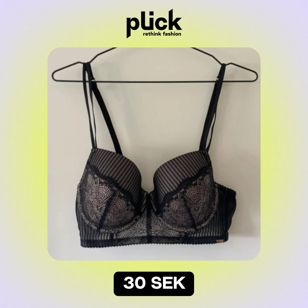 Säljer en elegant svart bh med spetsdetaljer och ett subtilt randigt mönster. Den har justerbara axelband och en klassisk hakknäppning bak. Perfekt för en festlig kväll eller när du vill känna dig extra fin.