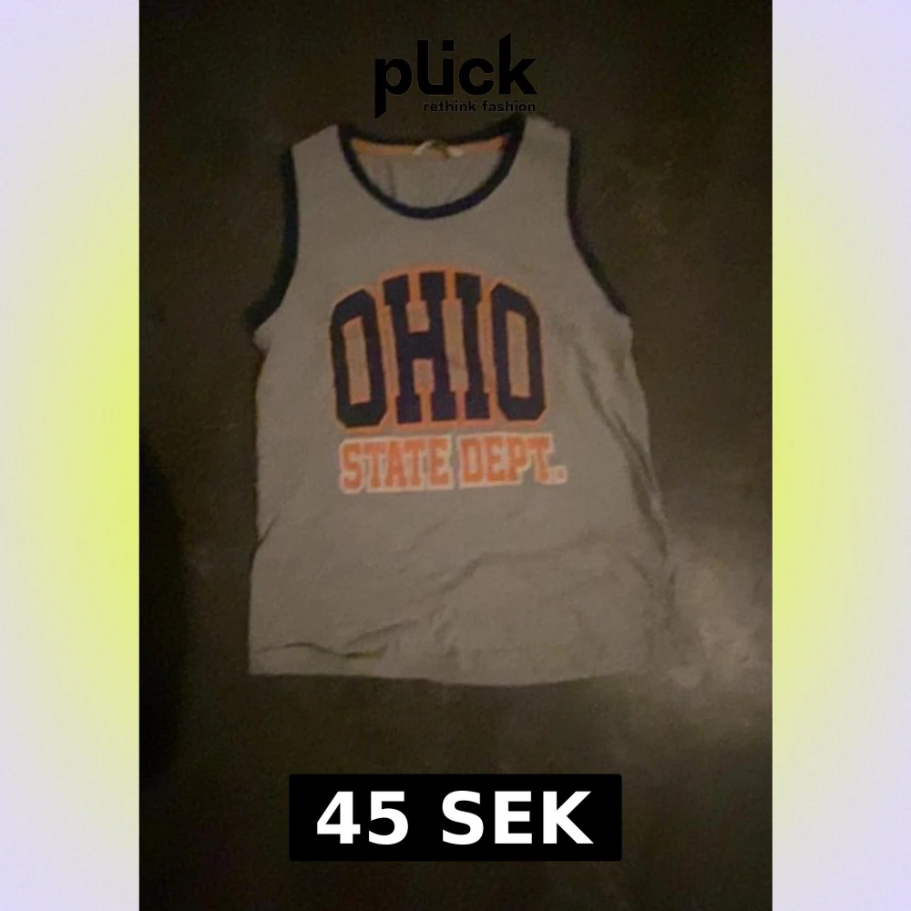Säljer en grå linnetopp från M&S med stort OHIO STATE DEPT.-tryck i blått och orange på bröstet. Toppen har mörkblå kant runt hals och ärmhål, och är tillverkad i mjuk bomull. Perfekt för dig som gillar sportig och avslappnad stil.
