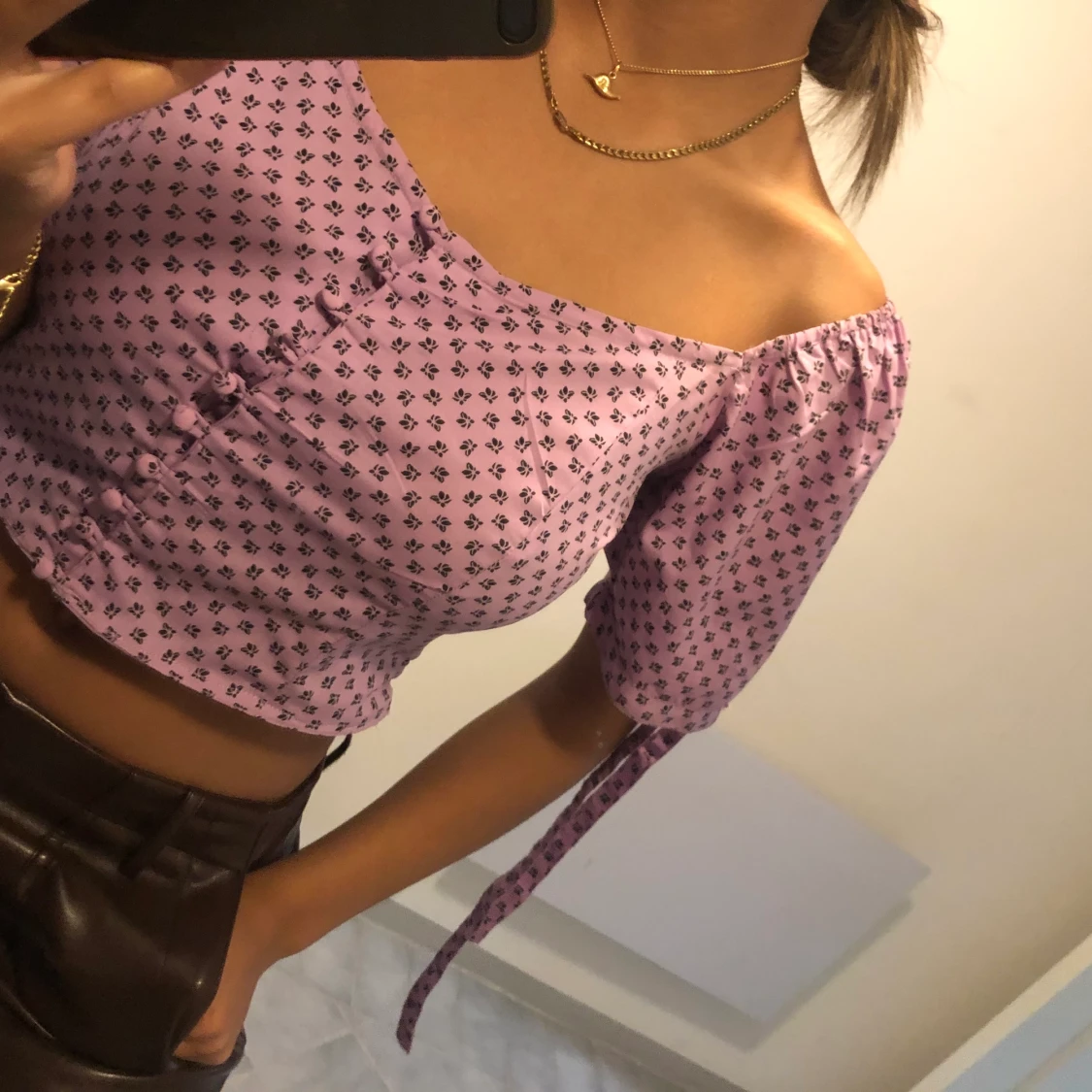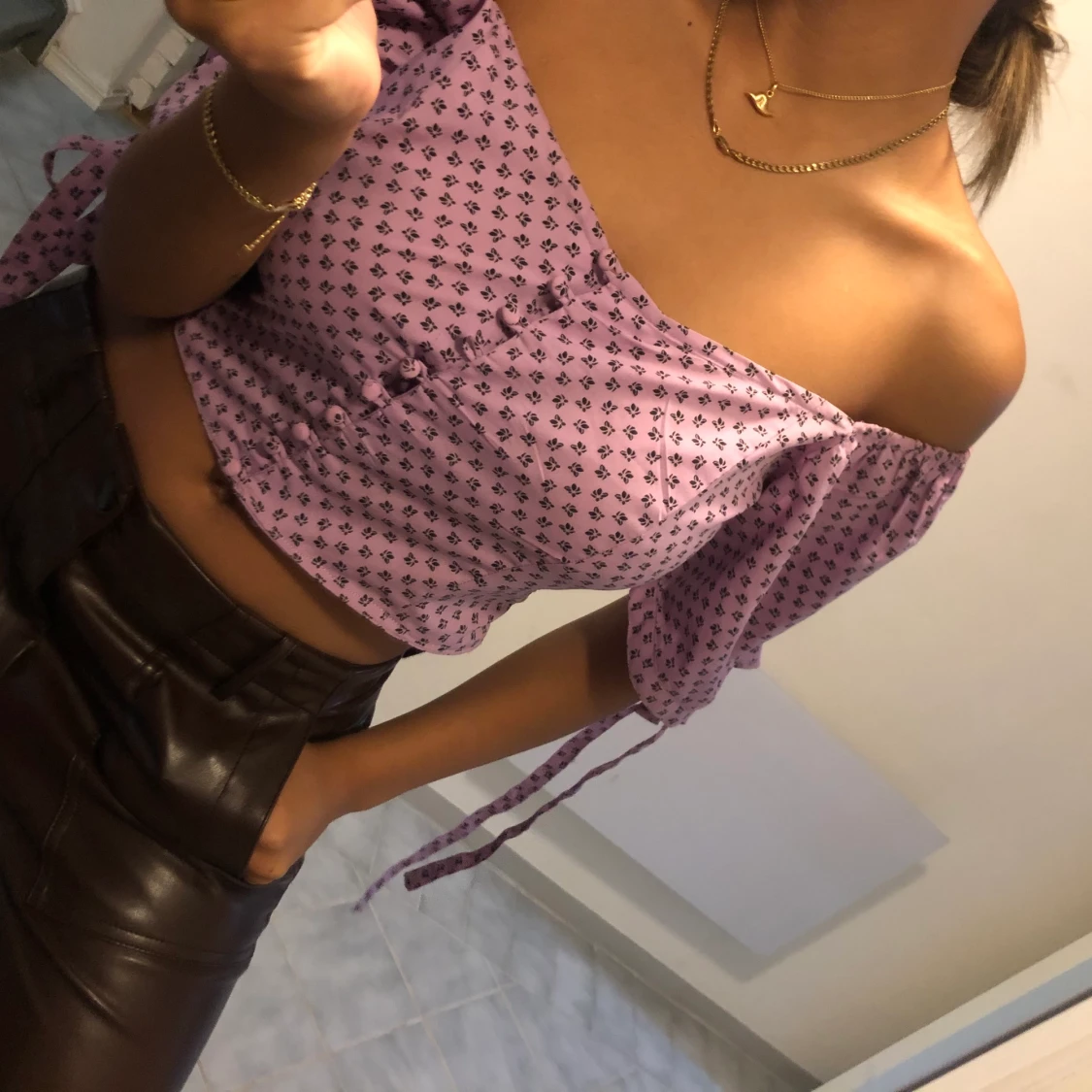 säljer denna skir snygga lila topp!! En knapp saknas men det sitter fast en knapp inuti tröjan som kan sys på! Lite stor på mig som har storlek S men den funkar ändå.