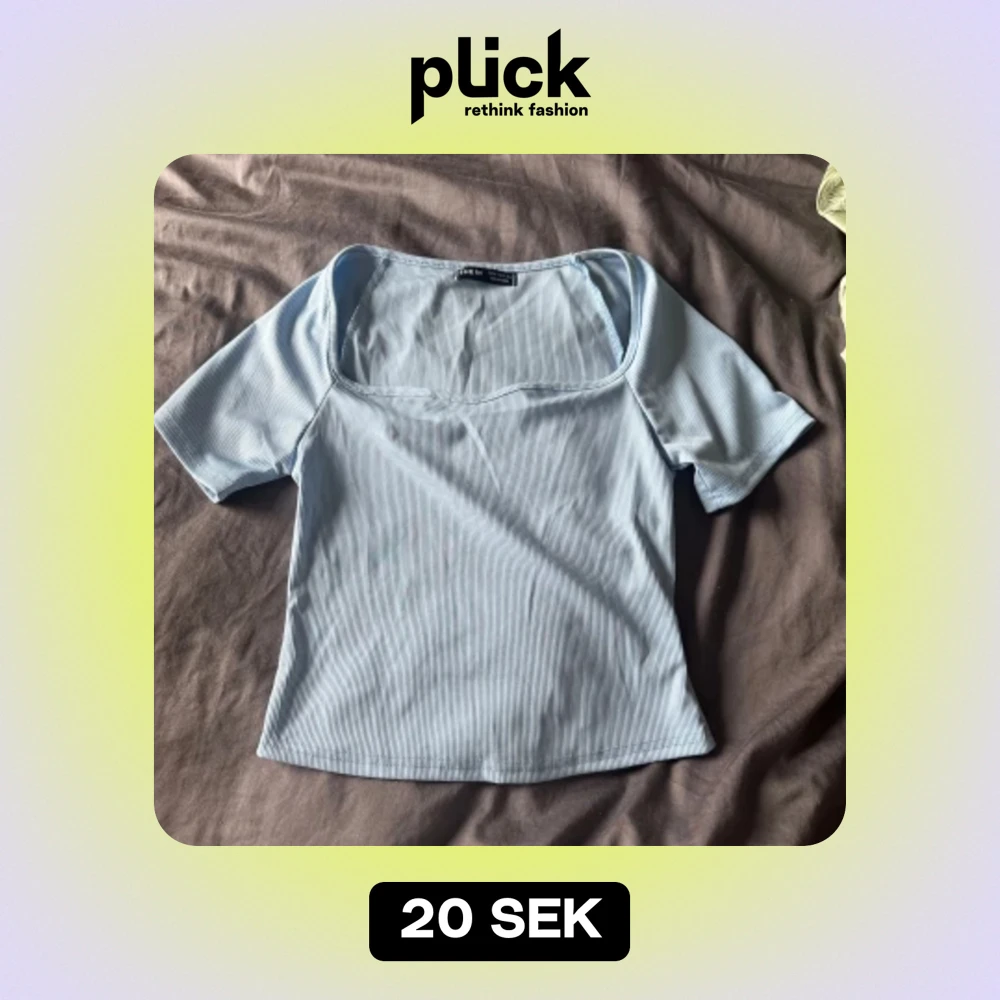 En ljusblå ribbad topp med korta ärmar och en fyrkantig halsringning. Toppen har en tight passform och är tillverkad i ett mjukt och stretchigt material.