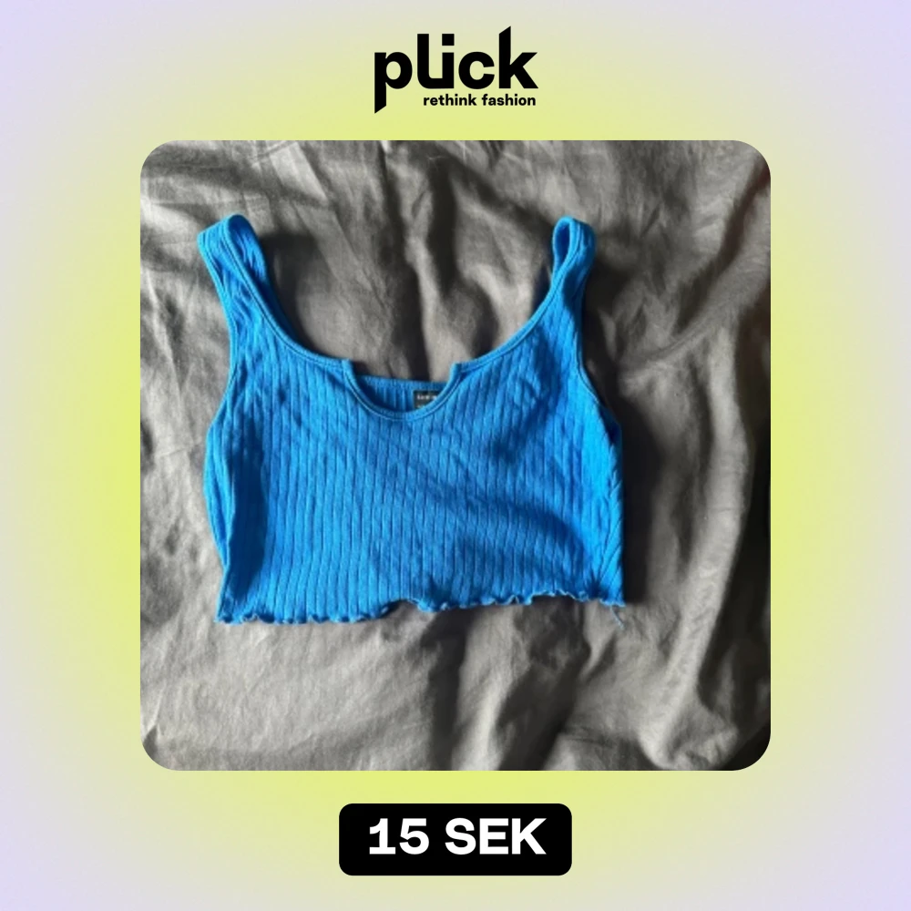 En blå ribbad linnetopp med breda axelband och en croppad design. Toppen har en rund halsringning och är tillverkad i ett stretchigt material.
