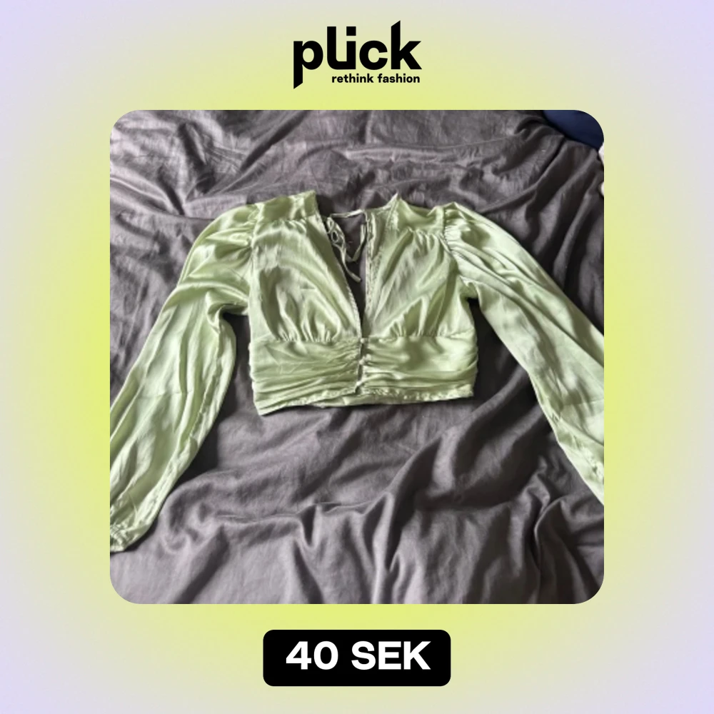 En elegant ljusgrön blus med långa ärmar och knytning bak, knappar fram. Blusen har en åtsittande passform med rynkade detaljer vid midjan och ärmarna.