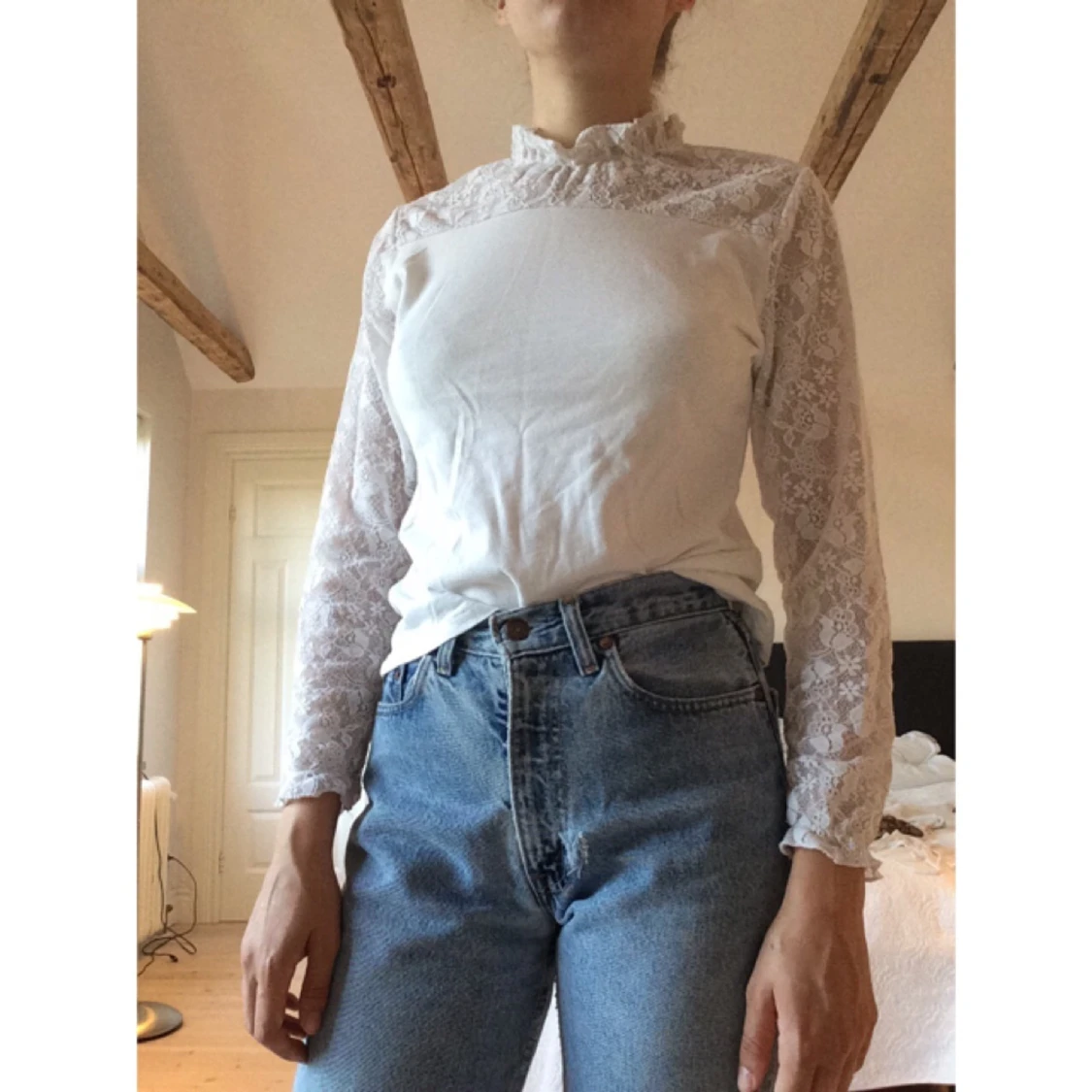 Vit långärmad tröja med vita spetsdetaljer och krus i hals och handleder.
