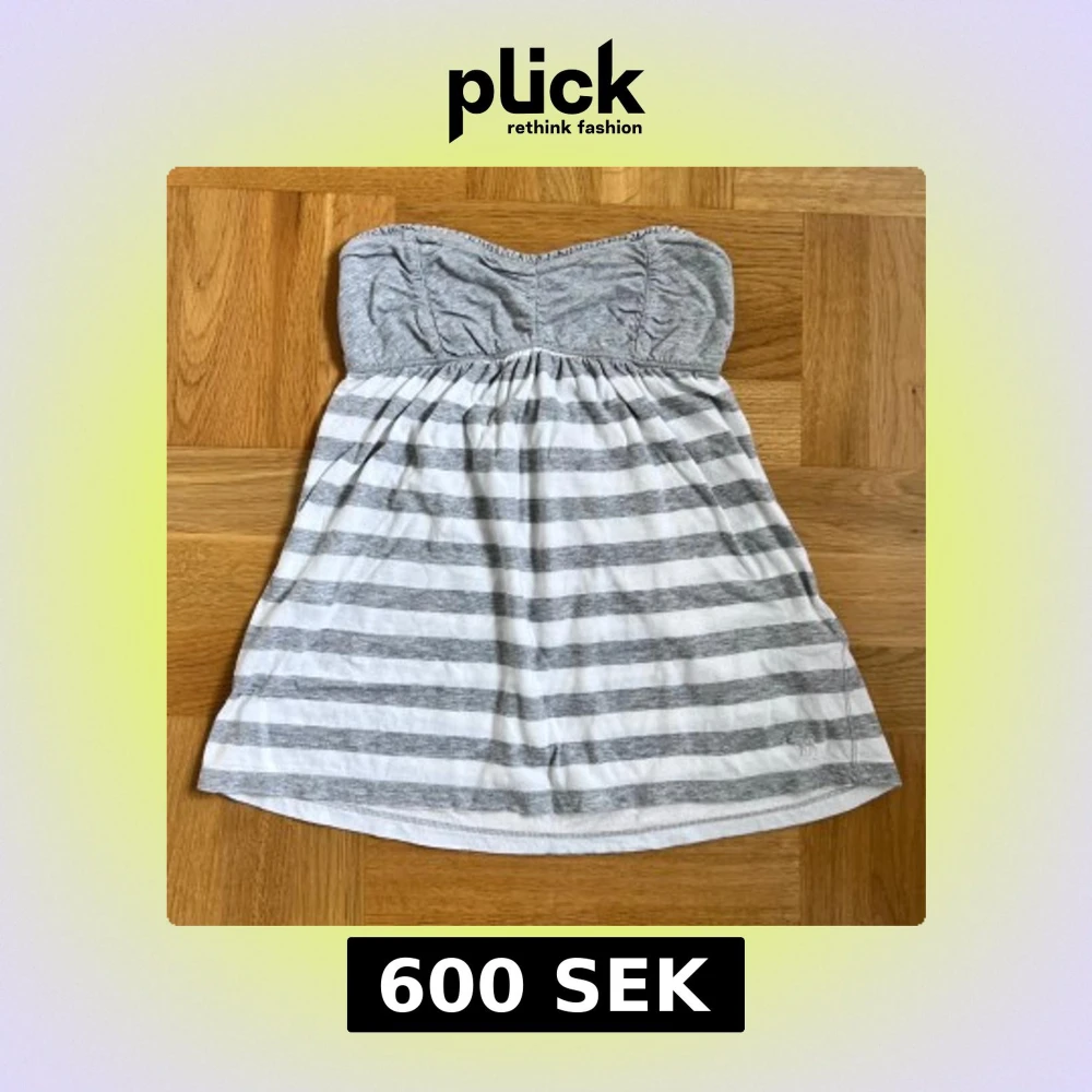 Superfin tubtopp från Abercrombie & Fitch i grått och vitt med ränder. Toppen är ärmlös och har en lätt rynkad byst samt broderad älgdetalj längst ner. Perfekt för varma dagar och chill vibes. Den är vintage och säljs inte längre. Storlek M men passar XS-M skulle jag säga