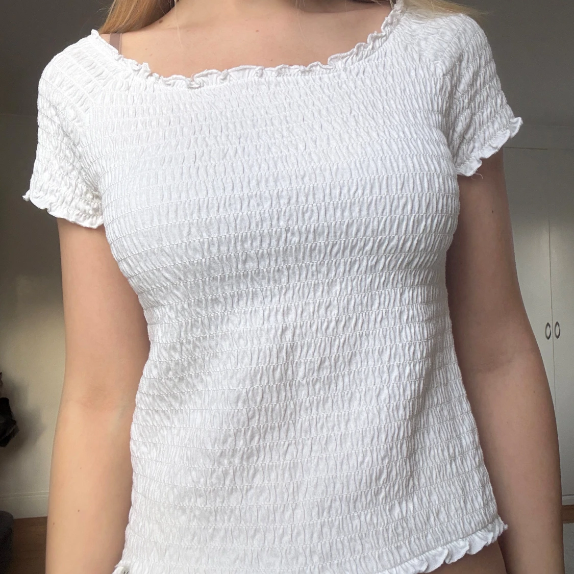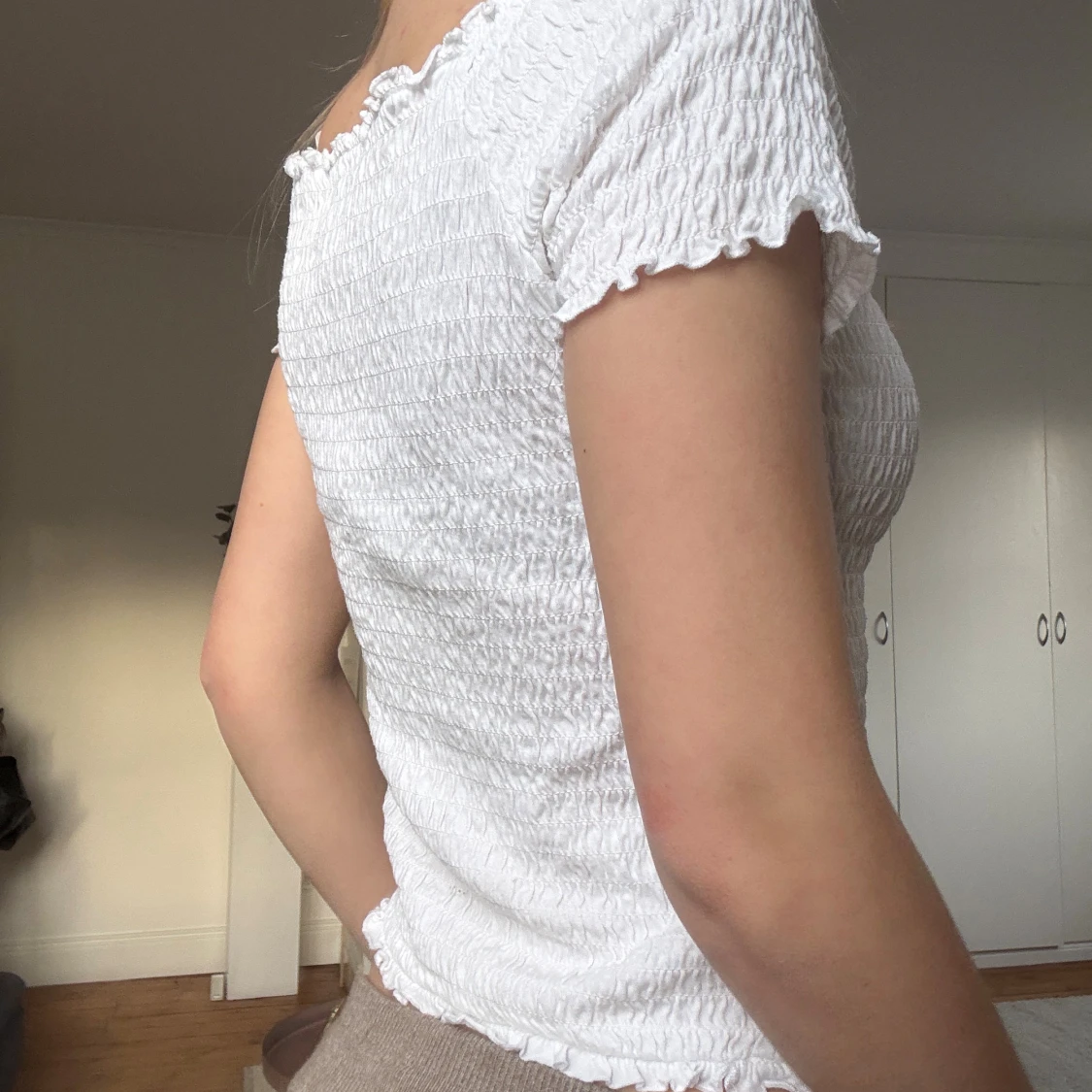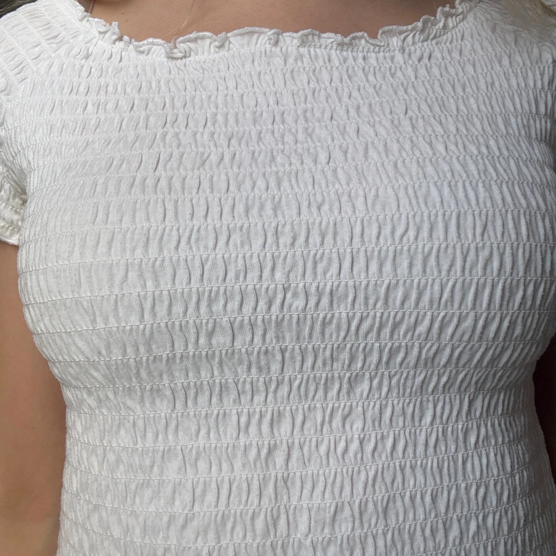 Supersöt vit topp med smockat tyg och volangkant vid halsringning, ärmslut och nederkant. Kortärmad, perfekt till jeans eller kjol. Skönt och stretchigt tyg. Står 15/16 år för storlek men passar mig som brukar ha XS.
