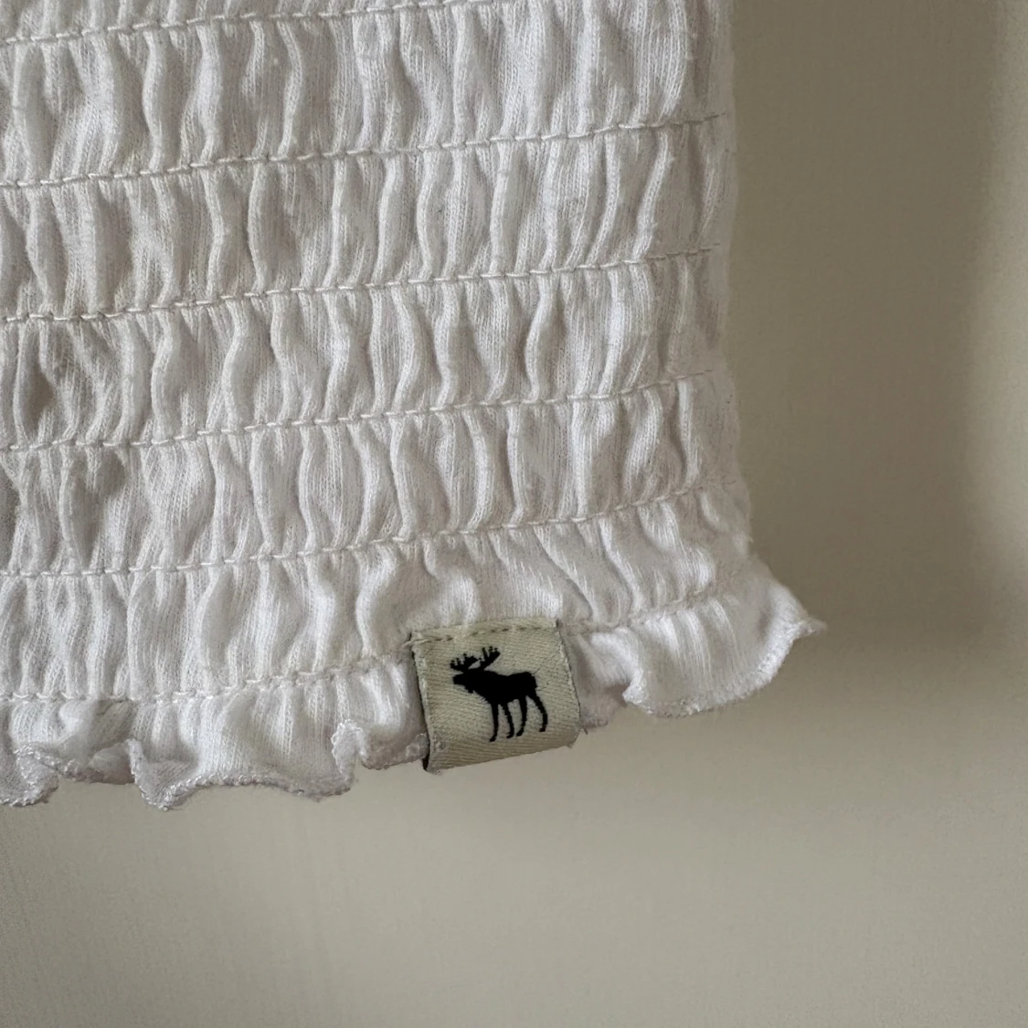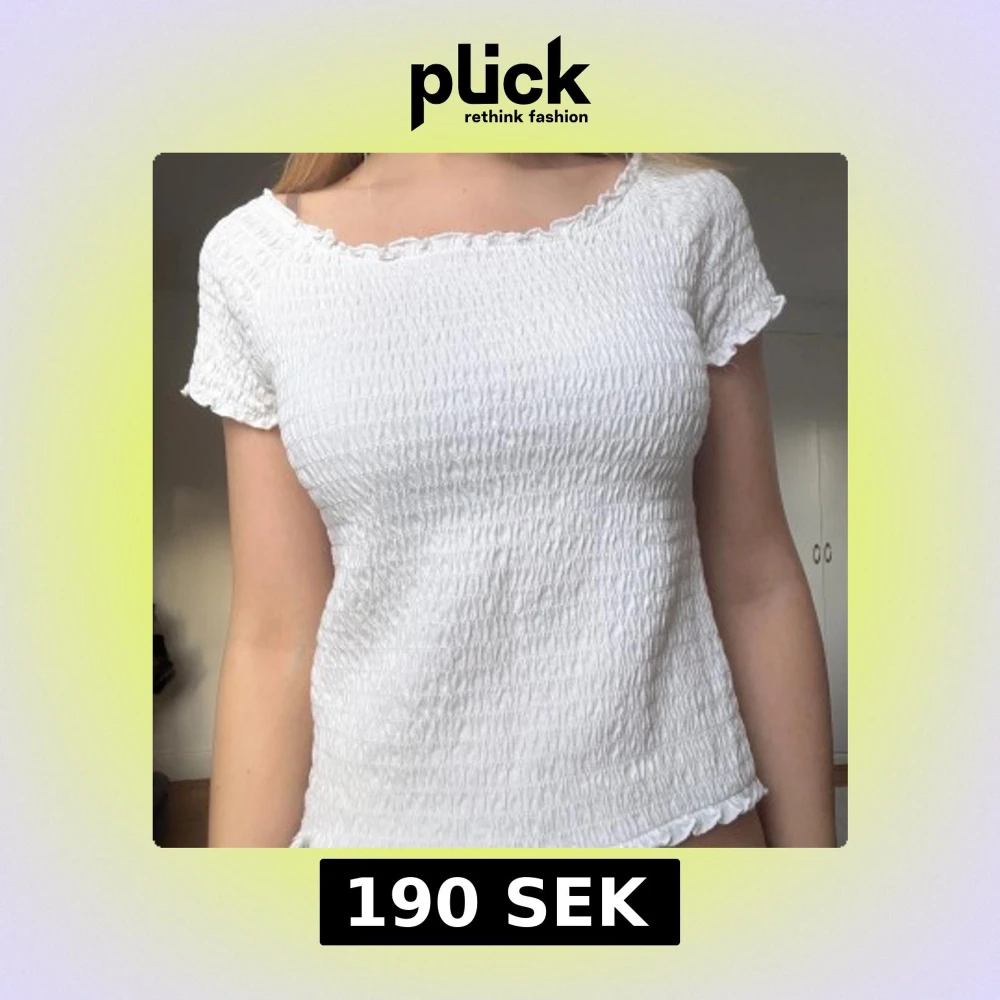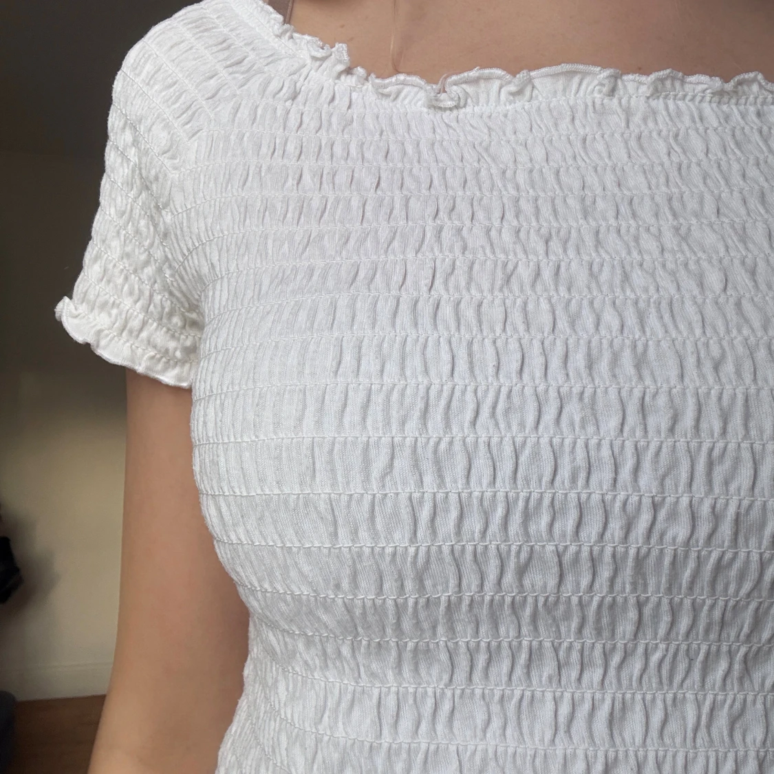 Supersöt vit topp med smockat tyg och volangkant vid halsringning, ärmslut och nederkant. Kortärmad, perfekt till jeans eller kjol. Skönt och stretchigt tyg. Står 15/16 år för storlek men passar mig som brukar ha XS.
