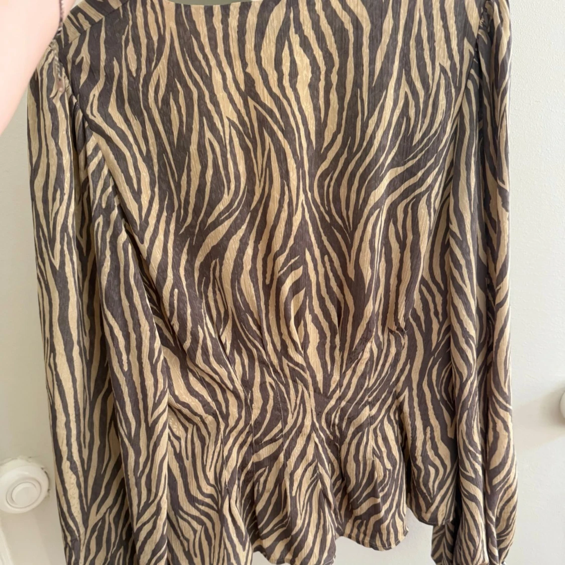 Supersnygg blus från Adoore med zebramönster i beige och brunt. Blusen har v-ringning, knappar framtill och vida, långa ärmar . Endast använd en gång, tyvärr för stor för mig.🥰💕