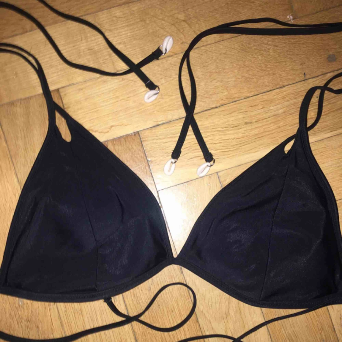 Svart bikini med snäckor på snörena. Helt oanvänd! Passar en xs/s/m i kupan beroende på hur täckande man vill att den ska vara. Och går att knyta hur tajt man vill både upp och ned till:) frakt 25kr