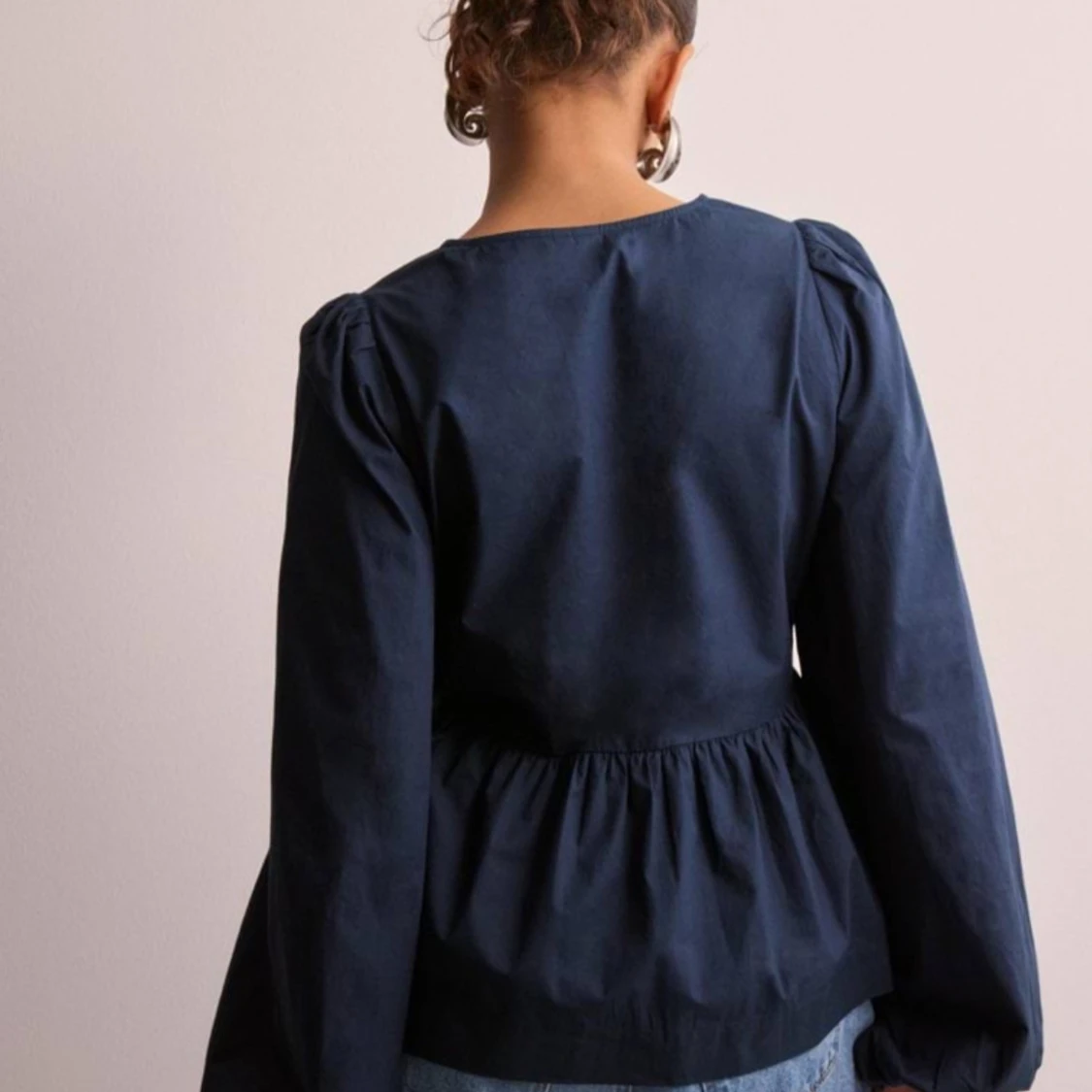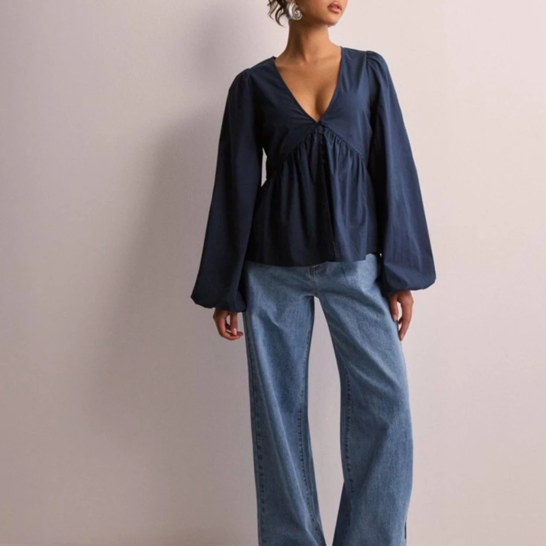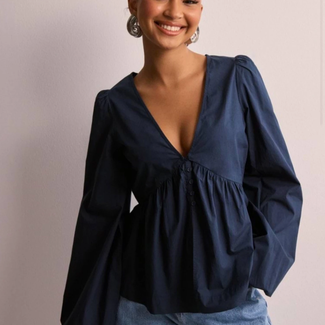 Säljer en superfin mörkblå blus med v-ringning och långa ärmar. Blusen har en lös passform och knappar framtill som ger en snygg detalj. Perfekt för både vardag och fest! Använd endast en gång så är i nyskick💕priset kan diskuteras