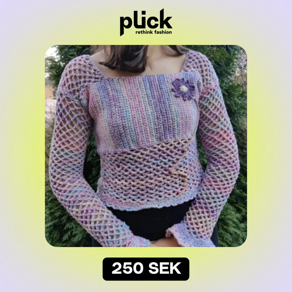 Virkad topp i bomull och akryl (50/50). Kan ta bort blomman om du skulle vilja det. Aldrig använd, endast för att ta bilder