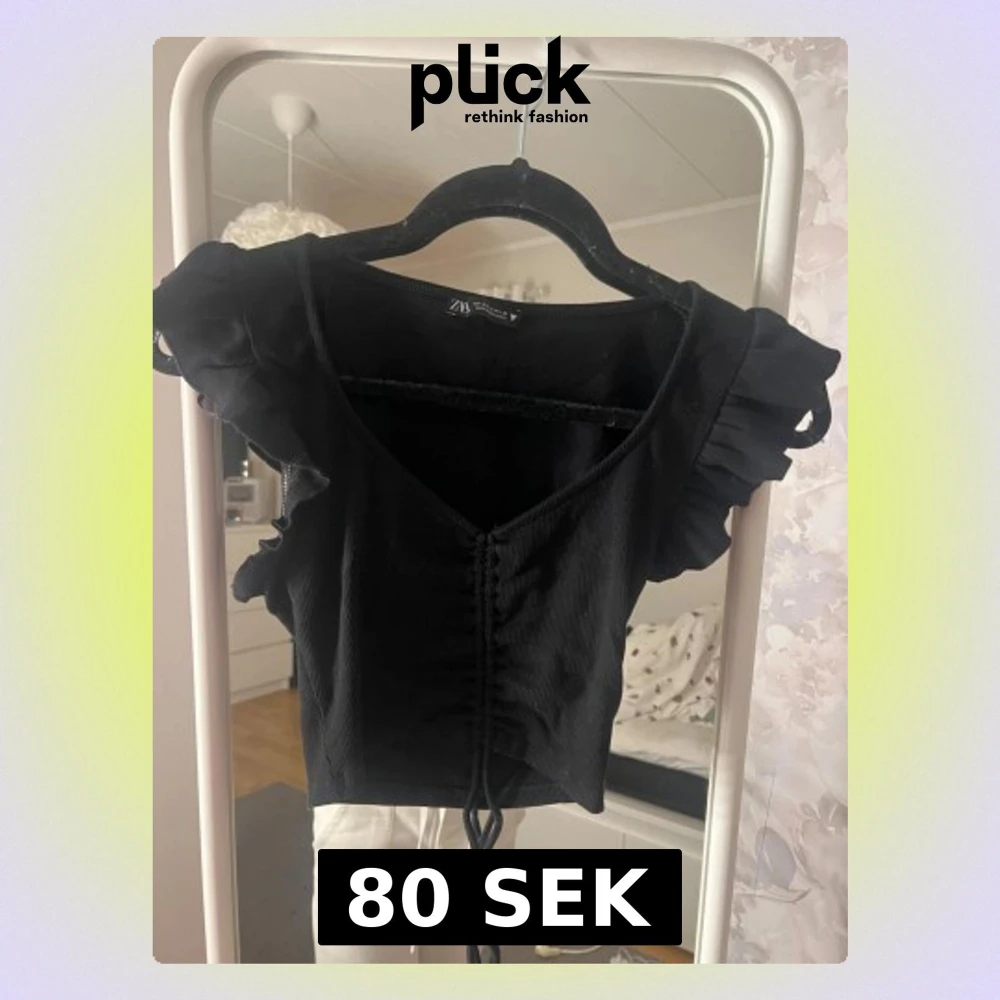 Säljer en svart croppad topp från Zara med v-ringning och snörning framtill. Toppen har volangdetaljer på axlarna och är tillverkad i ett mjukt ribbat material. Perfekt för dig som vill ha en trendig och stilren look.