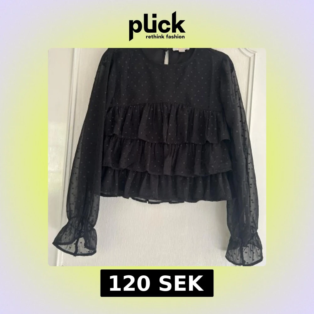 Supersöt svart blus från Gina Tricot med flera volanglager och små glittriga prickar. Blusen har transparenta långärmade ärmar med resår och volang vid ärmslut. Perfekt för dig som gillar en trendig och lekfull stil💕😻 Säljer för att jag har vuxit ur denna