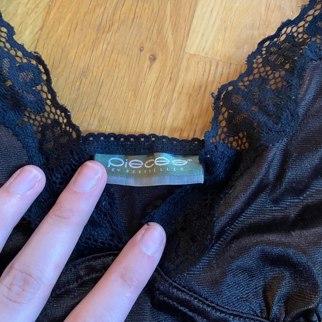 Säljer ett svart linne från Pieces med spetsdetaljer vid halsringningen. Linnet har tunna axelband och en mjuk, glansig yta. Perfekt för en elegant look.
