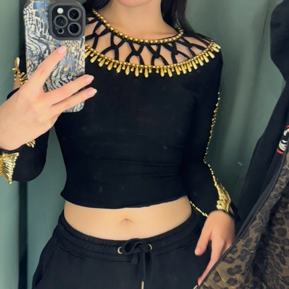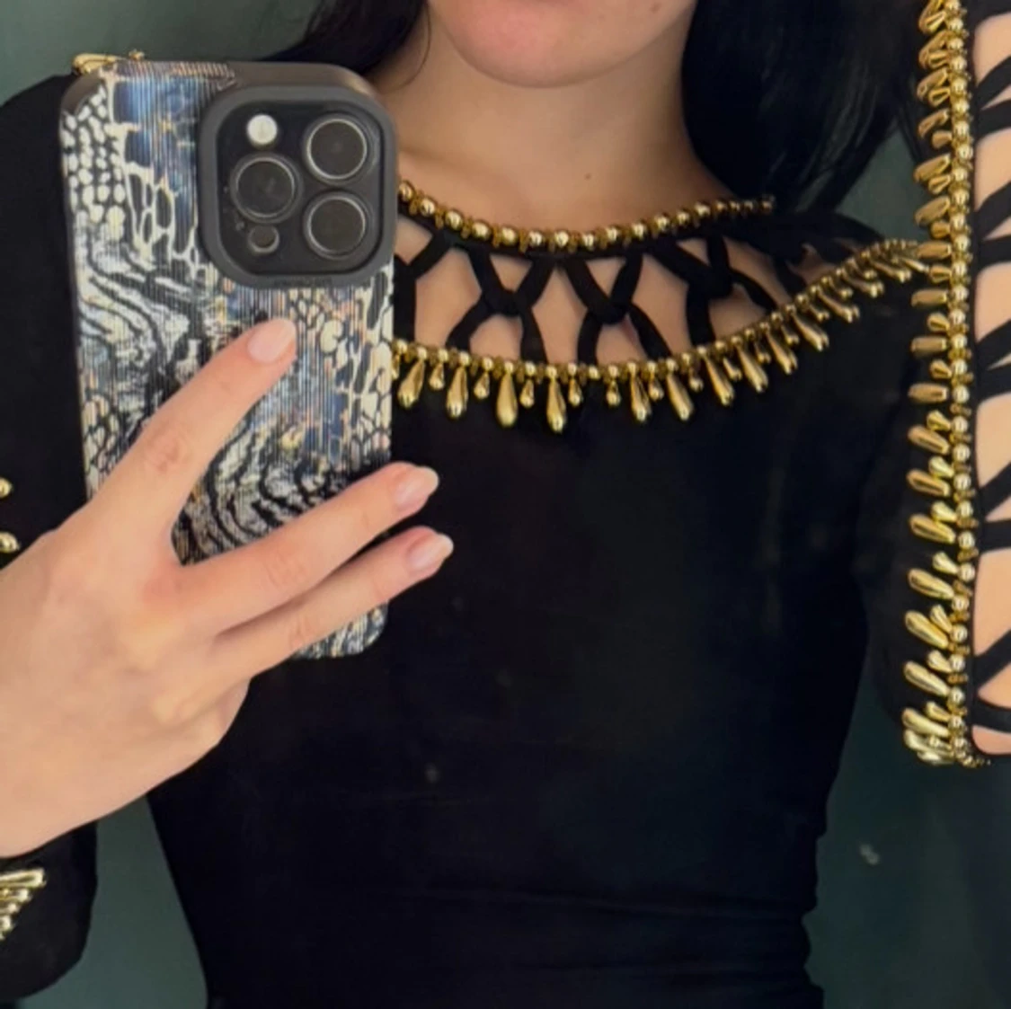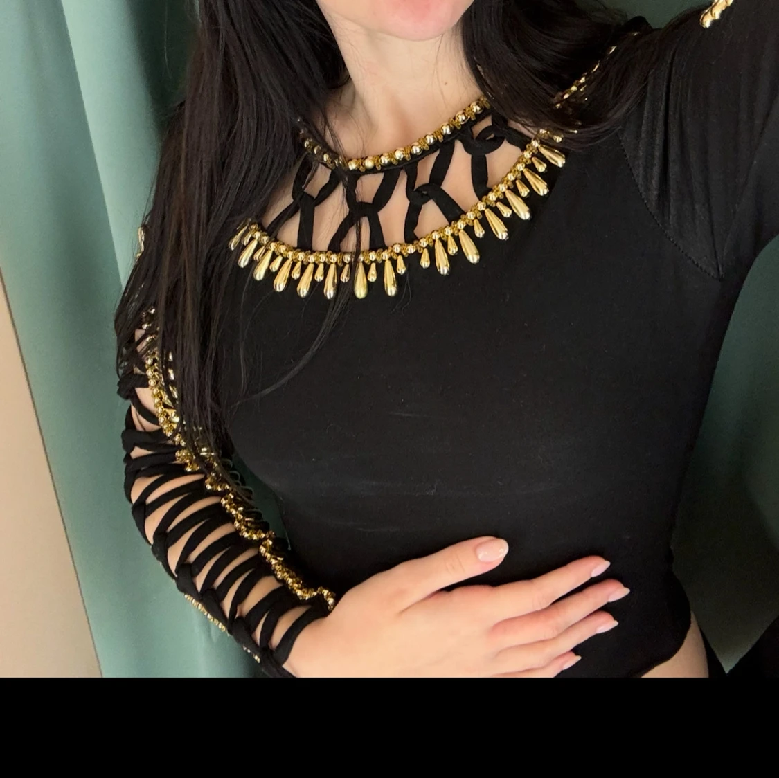 Säljer en svart långärmad topp med unika guldfärgade detaljer längs halsringning och ärmar. Toppen har ett coolt utskuret mönster upptill och längs armarna som ger en edgy look. Säljer då den inte kommer till användning.