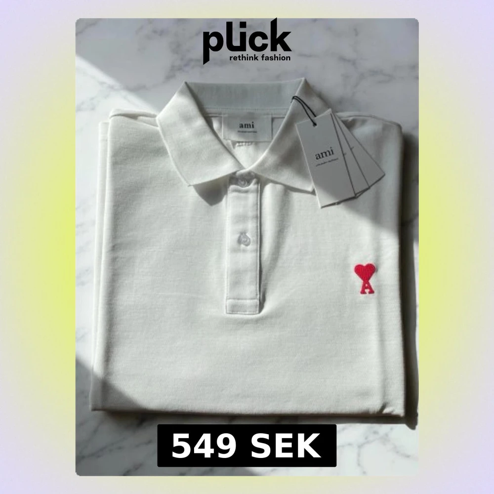 Klassisk vit pikétröja från Ami med röd broderad logga i form av ett hjärta på bröstet. Tröjan har krage, knappar framtill och är tillverkad i bomull. Perfekt för en clean och stilren look.