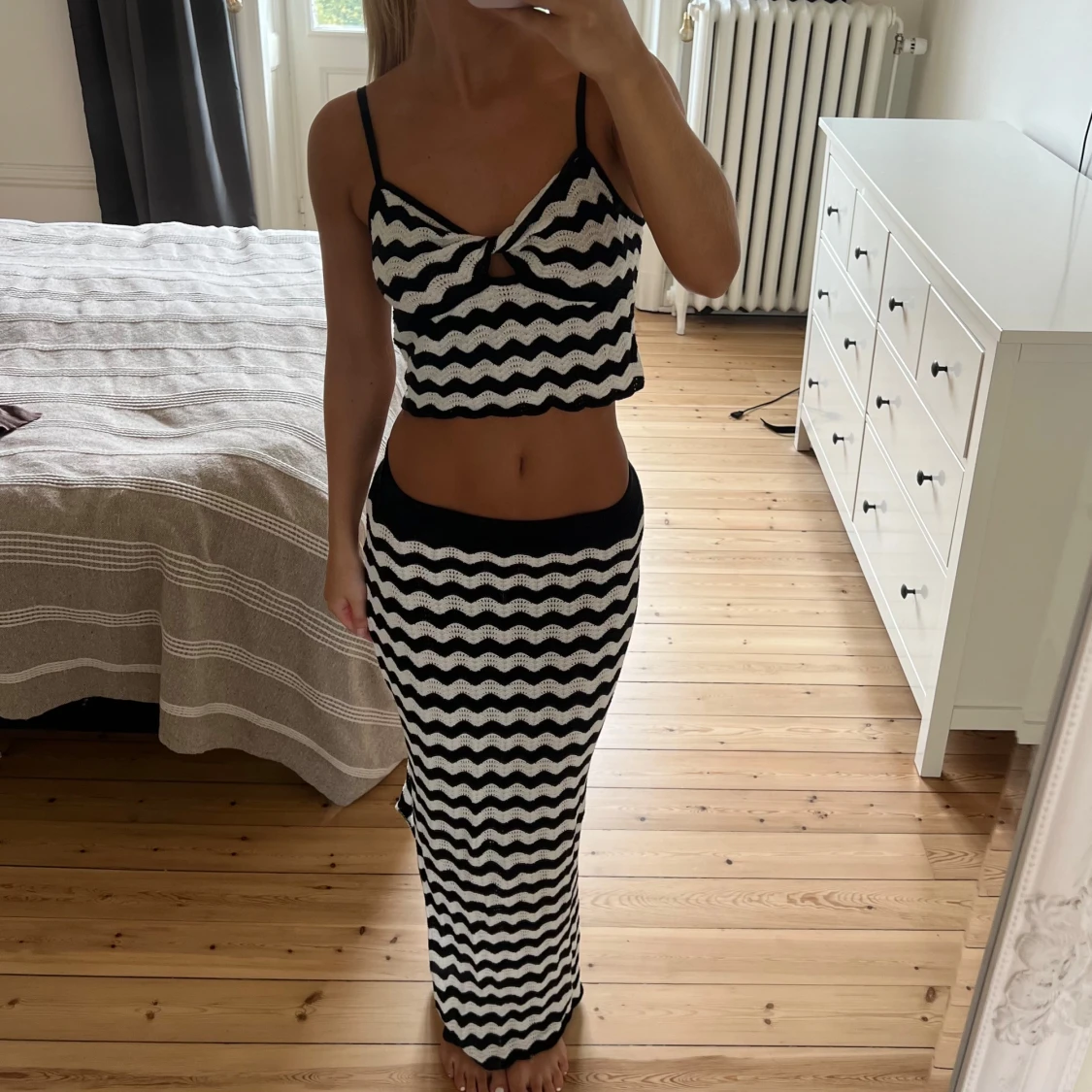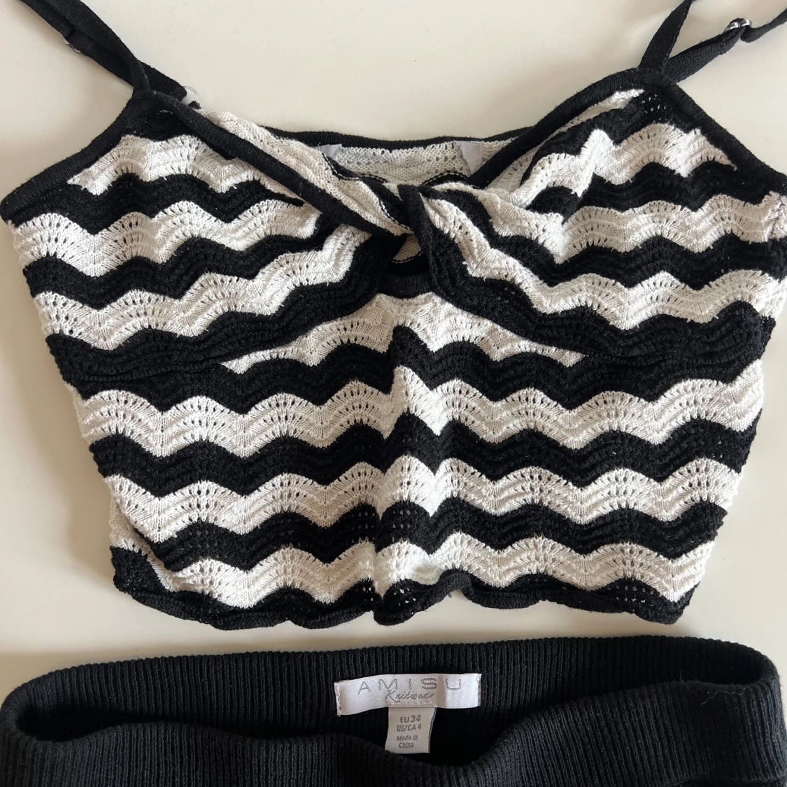 Säljer en croppad stickad topp från Amisu med smala axelband och vågigt svartvitt mönster. Toppen har en liten knutdetalj framtill och är perfekt för dig som gillar en trendig och lekfull stil. Materialet är mjukt och luftigt, perfekt för varmare dagar.