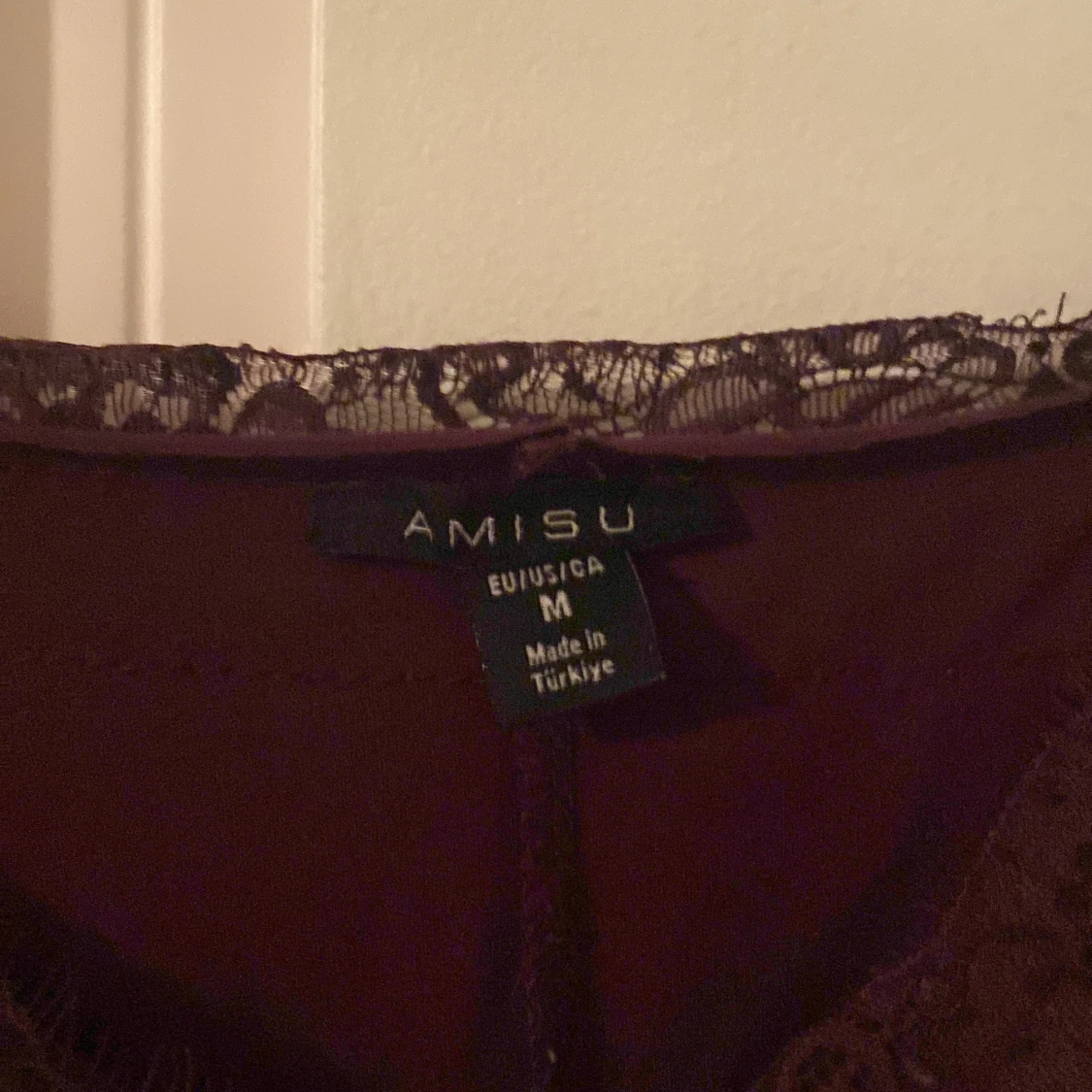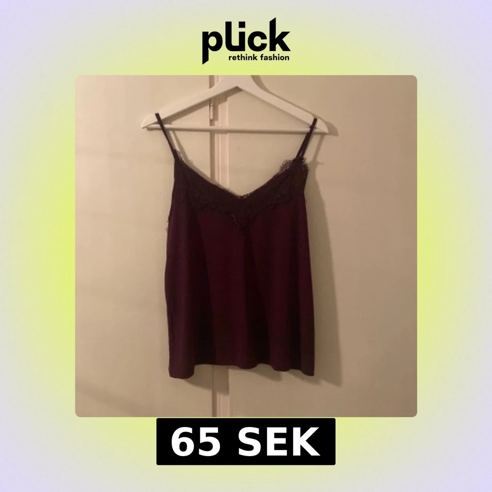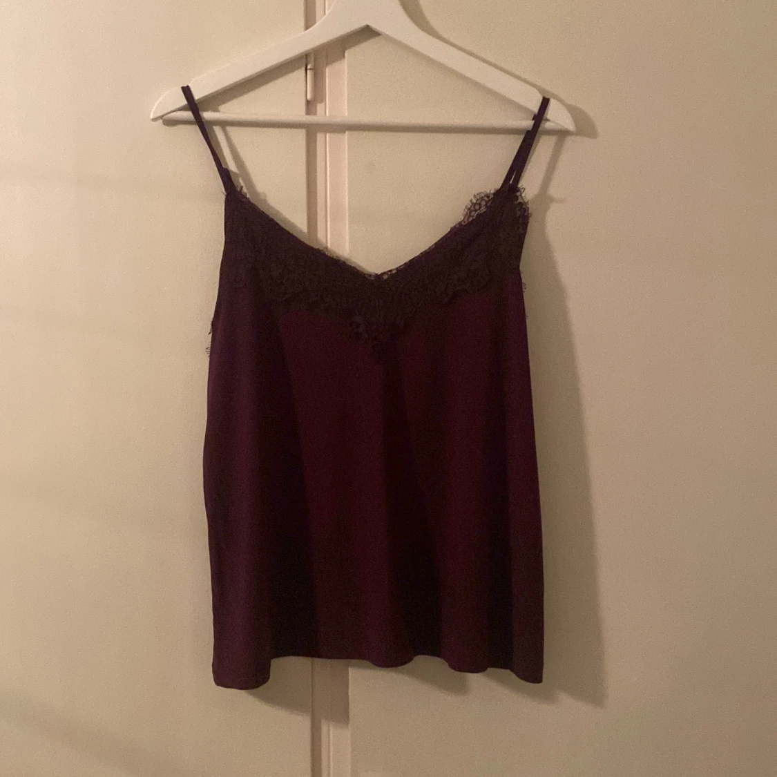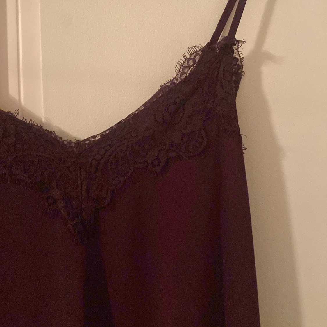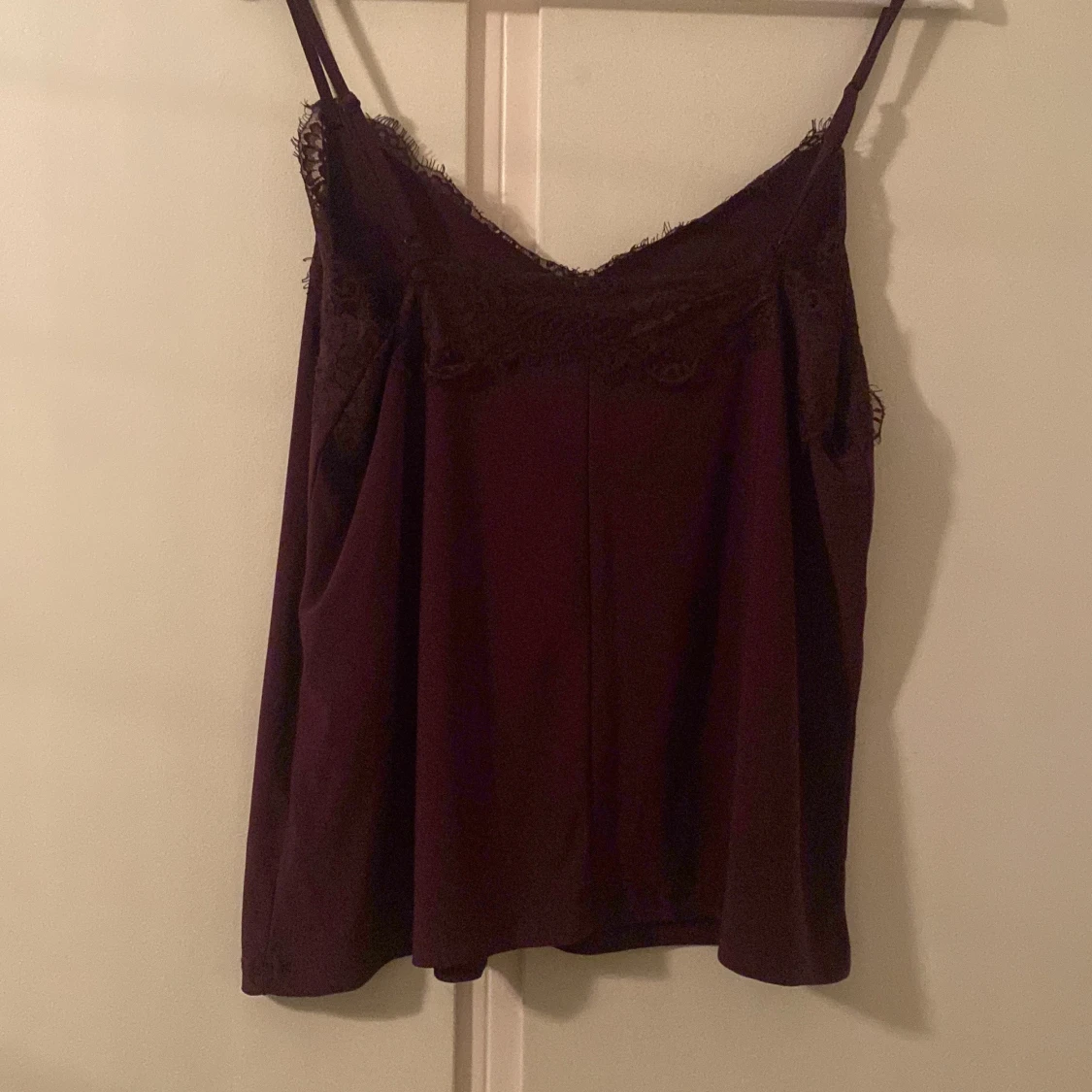 Säljer en vinröd linnetopp från Amisu med tunna axelband och vacker spetsdetalj längs urringningen. Toppen har en mjuk, flowy passform och är perfekt för dig som gillar en stilren men ändå romantisk look.
