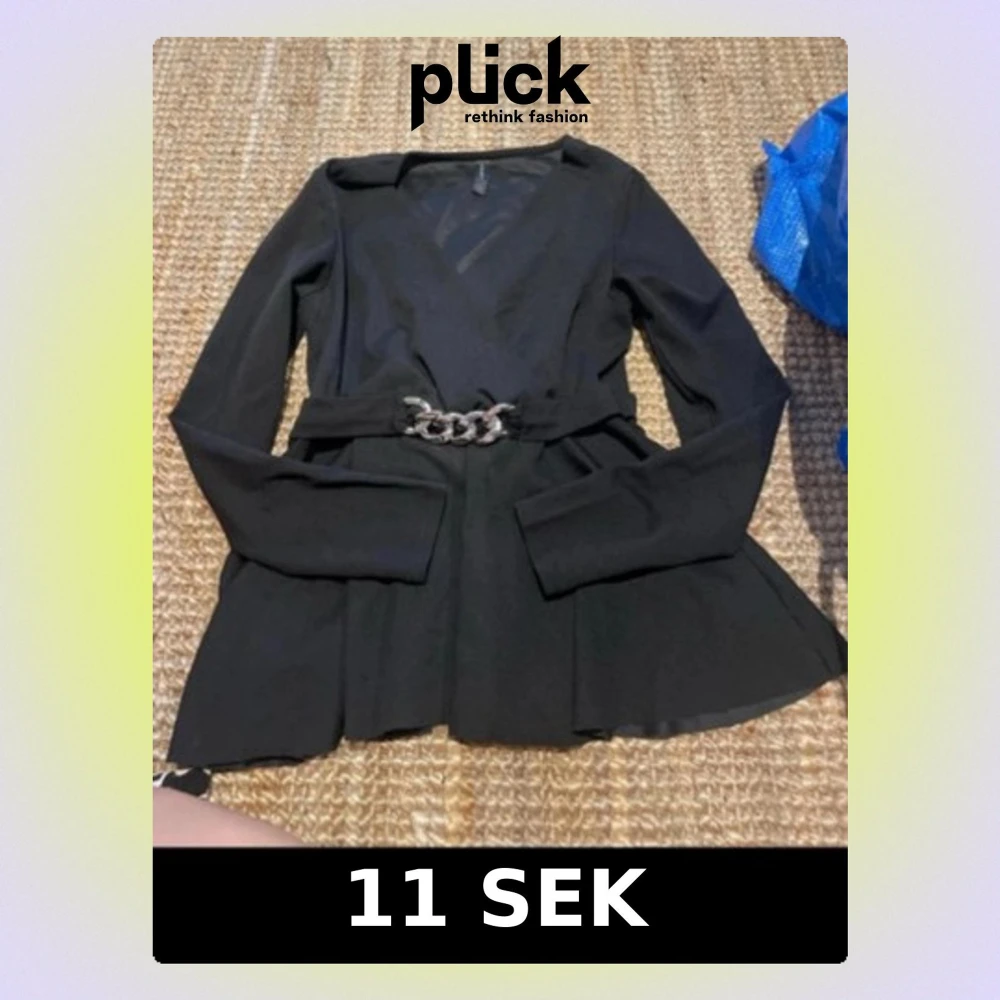 Snygg svart omlottopp från Amisu med långa ärmar och en cool silverfärgad kedjedetalj i midjan. Toppen har v-ringning och markerad midja som ger en riktigt schysst siluett. Perfekt att styla med jeans eller kjol.