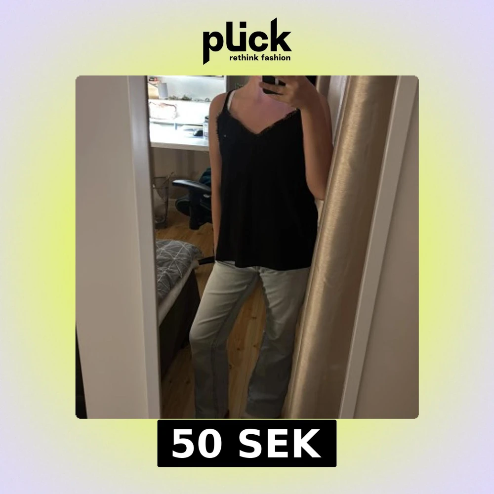 Svart linnetopp från Amisu med tunna axelband och v-ringning med spets. Toppen har en lös passform och är perfekt för en stilren. Den är lite nopprig men inget som syns super mycket. Skriv privat för mer bilder💋