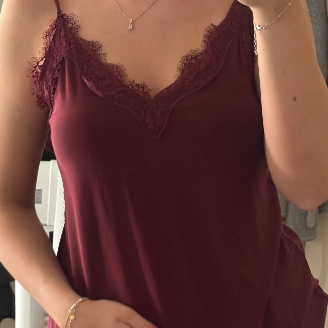 Supersnygg vinröd linnetopp från Amisu med tunna axelband och v-ringning dekorerad med spets. Säljs då den ej kommer till användning.
