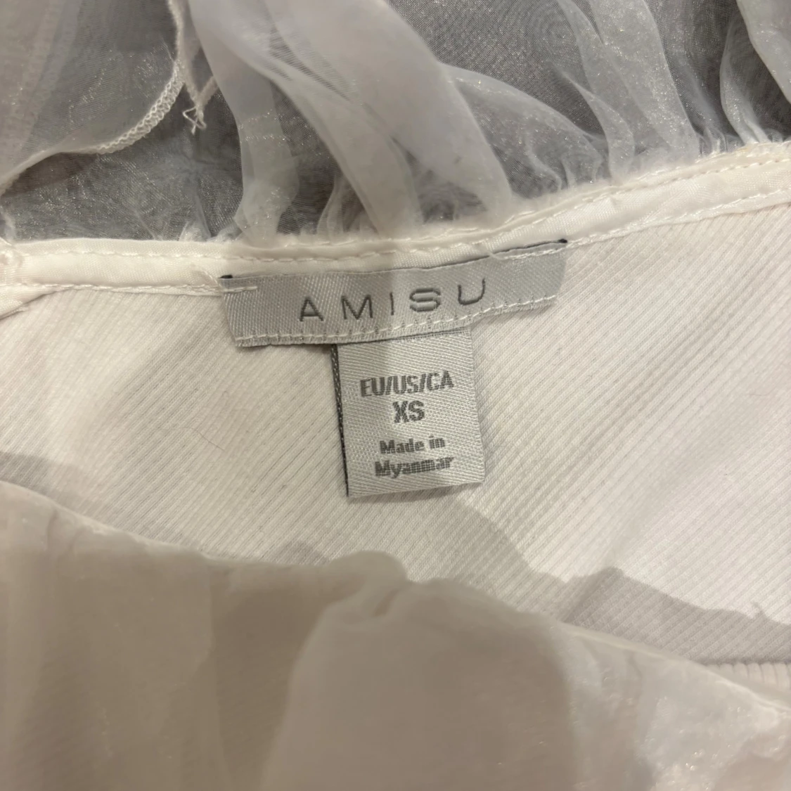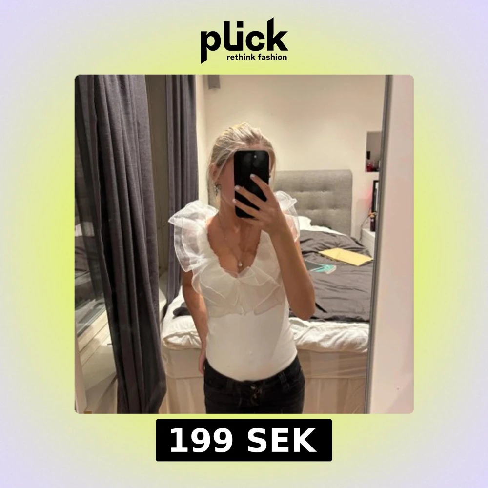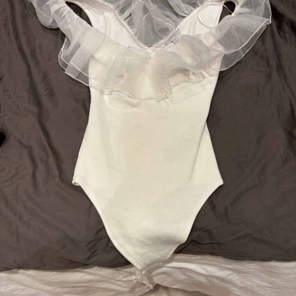 Säljer en vit body från Amisu i storlek XS med transparenta volanger runt axlar och halsringning. Toppen är ärmlös och har en slim passform med ribbad struktur. Perfekt för dig som gillar statement-detaljer och en feminin look. Säljer då den inte används.