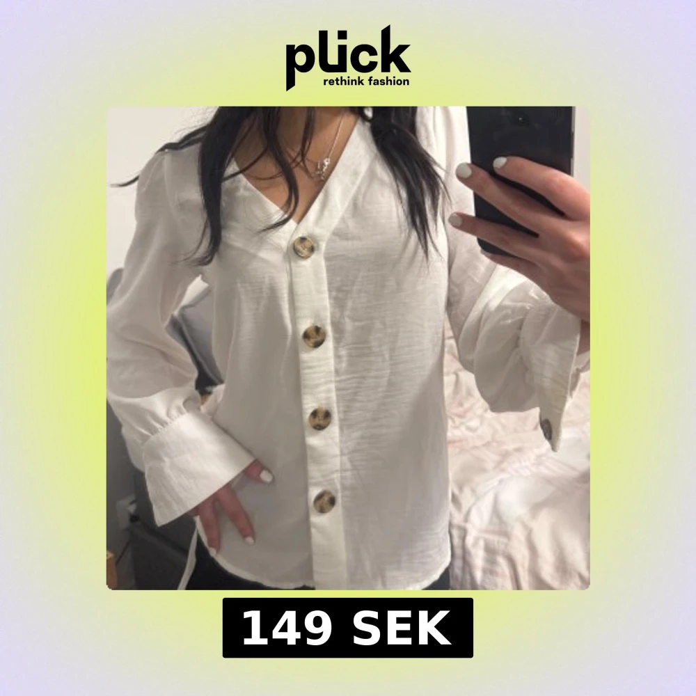 Säljer en vit blus med v-ringning och stora, mönstrade knappar framtill. Blusen har långa ärmar med breda manschetter och knappdetaljer. Den är tillverkad i ett lätt och luftigt tyg, perfekt för en stilren look.