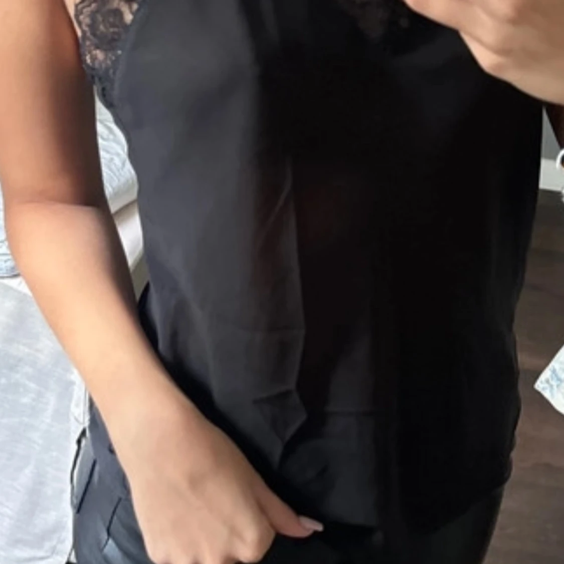 Säljer en svart linnetopp med tunna axelband och snygga spetsdetaljer längs v-ringningen. Toppen har en loose passform och är perfekt för dig som gillar en enkel men ändå chic look. Materialet känns lätt och svalt mot huden.