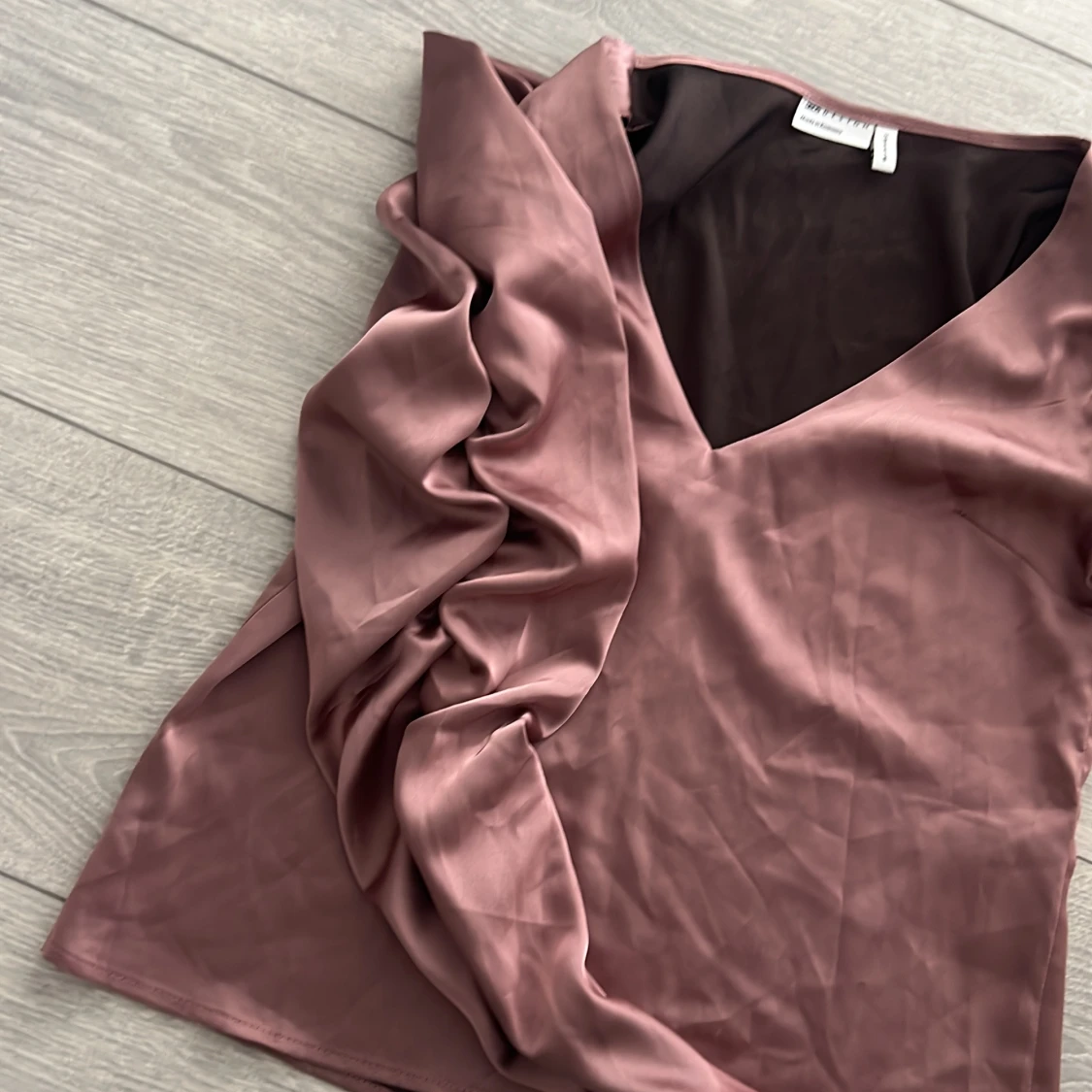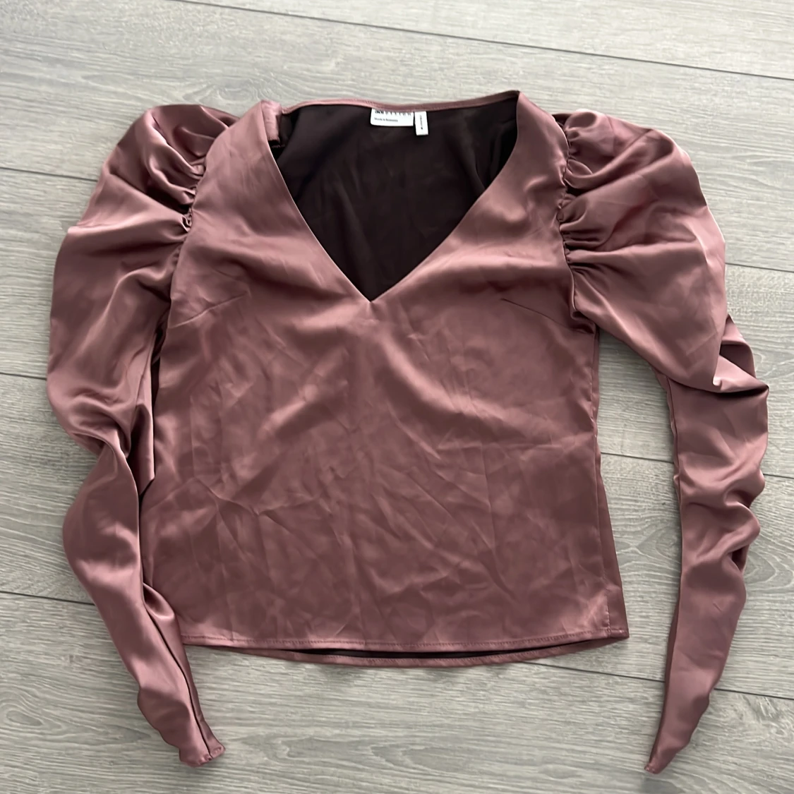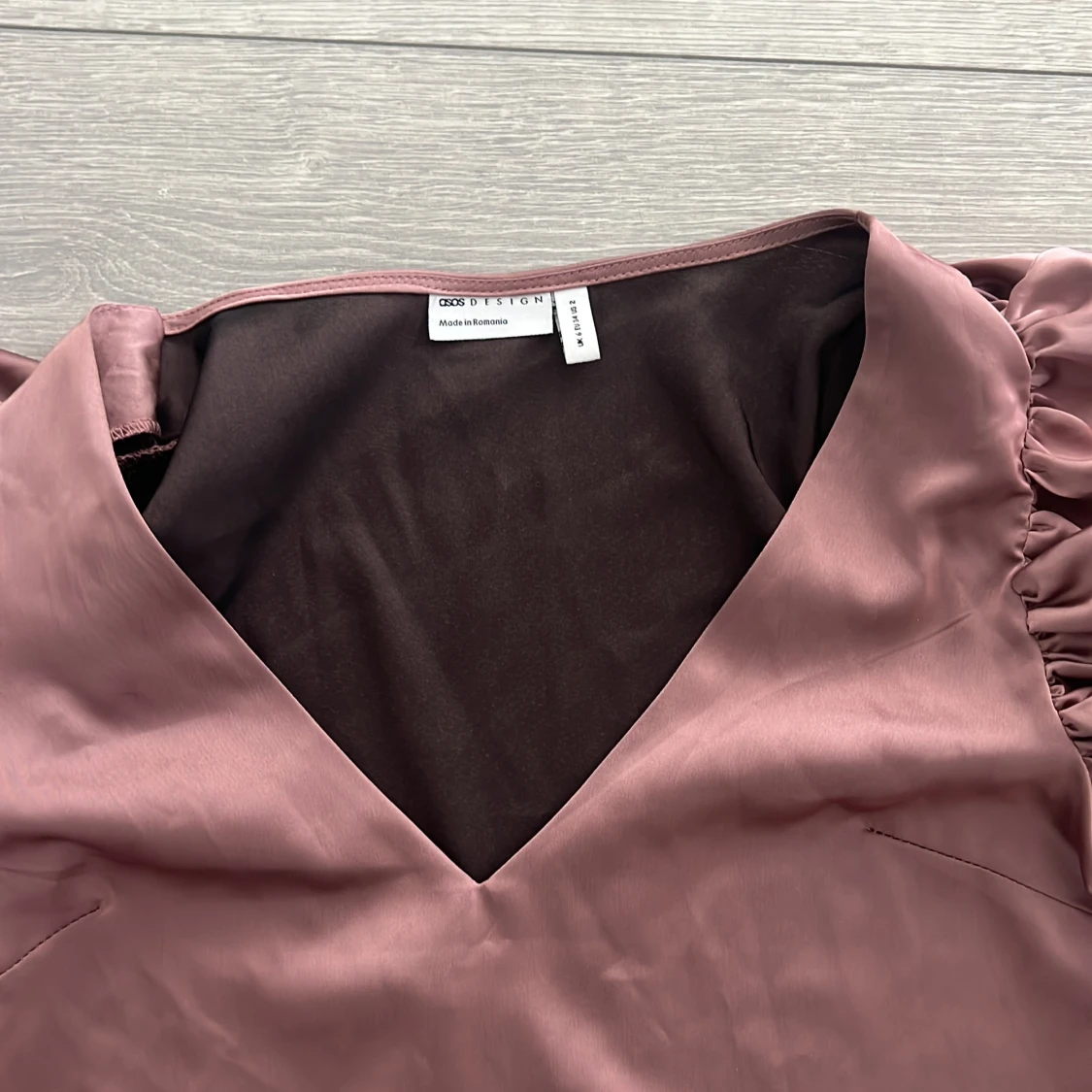 Säljer en elegant rosa blus i satin från ASOS med långa puffärmar och v-ringning. Perfekt för en stilren look.