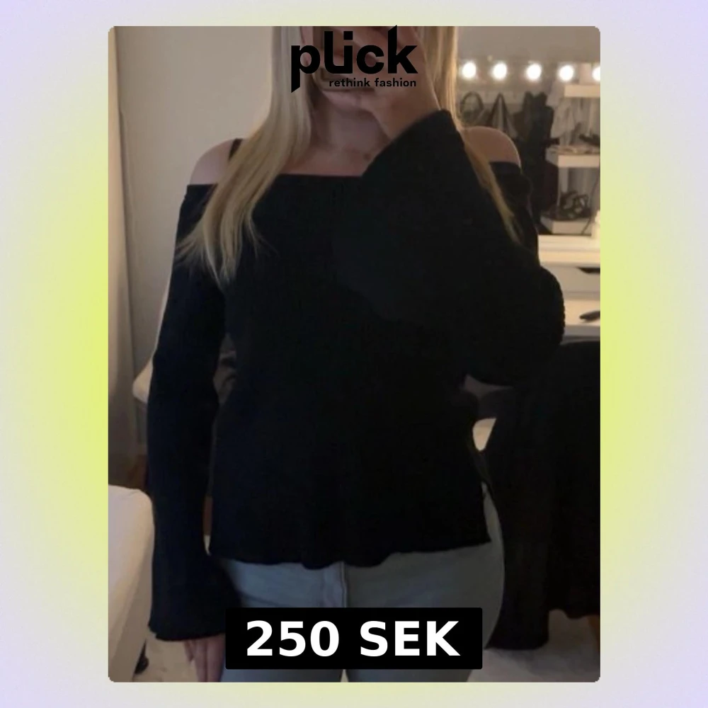 Säljer en svart offshoulder topp med långa, vida ärmar. Toppen har en rak skärning över axlarna och sitter snyggt figurnära. Perfekt att styla med jeans eller kjol.