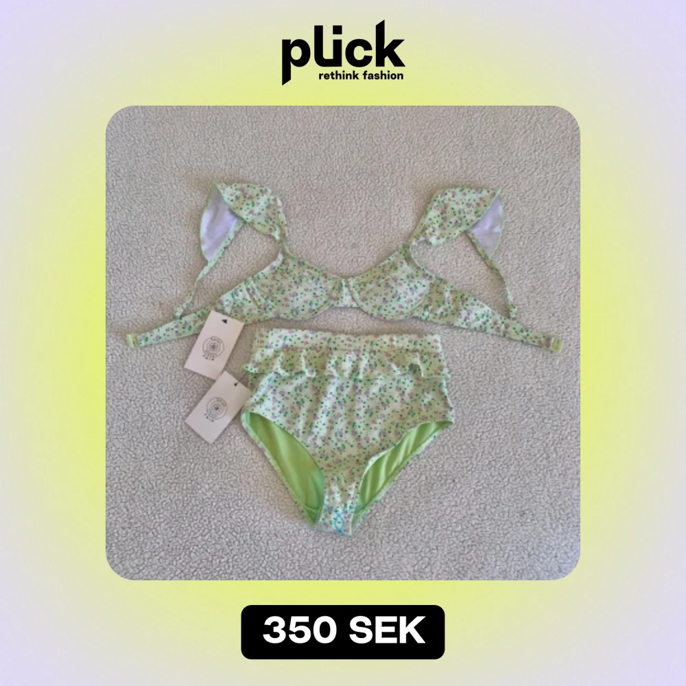 Otroligt söt bikini med volanger och högmidjad bikiniunderdel. Ny med tags kvar. Storlek 36 i båda delar.