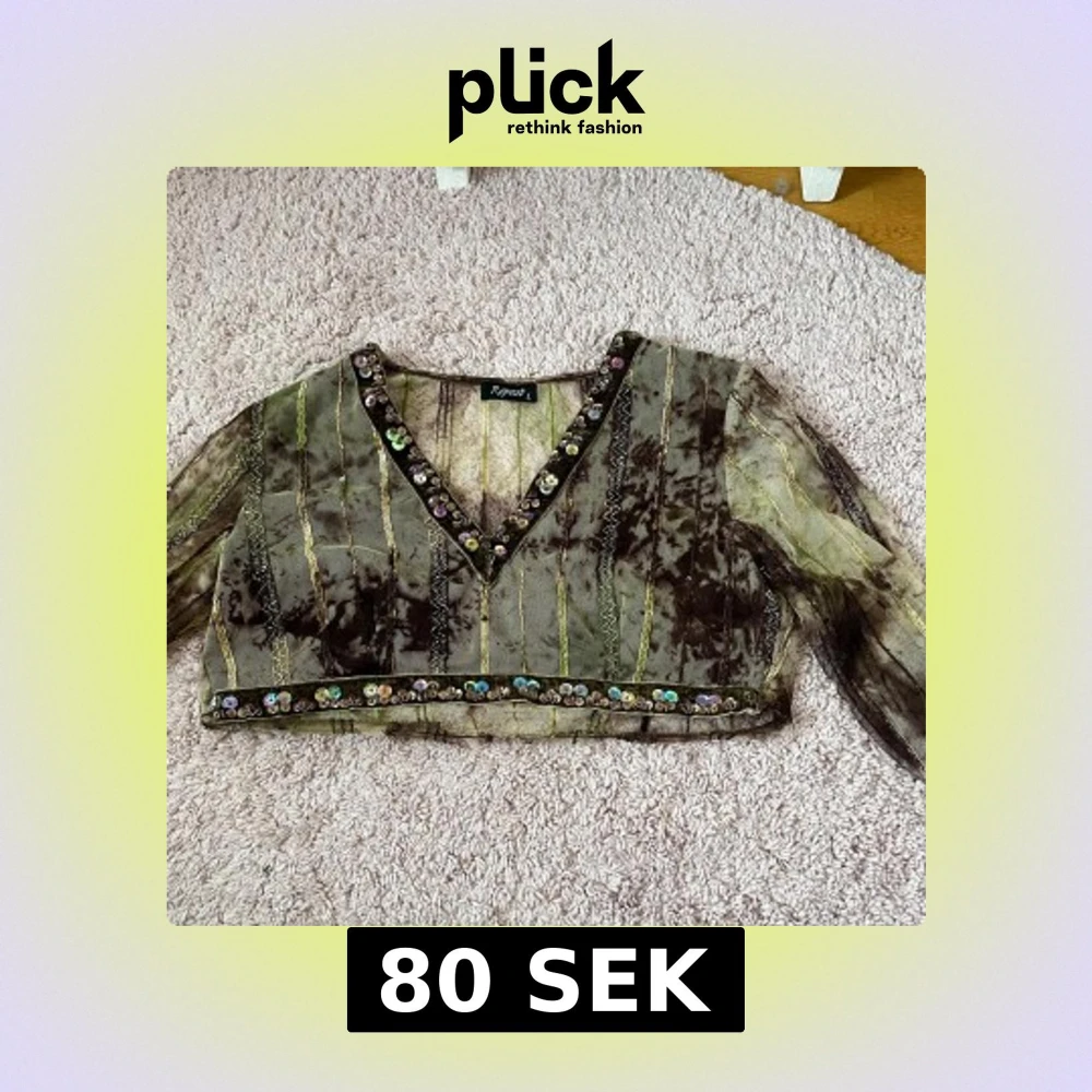 Säljer en unik transparent croppad topp från Repeat i gröna och bruna toner. Toppen har v-ringning och är dekorerad med paljetter längs halsringning och nederkant. Långa ärmar och broderade detaljer ger en cool look. Jag köpte denna secondhand för några år sedan och klippte av den så att den nu är mer av en croptop.