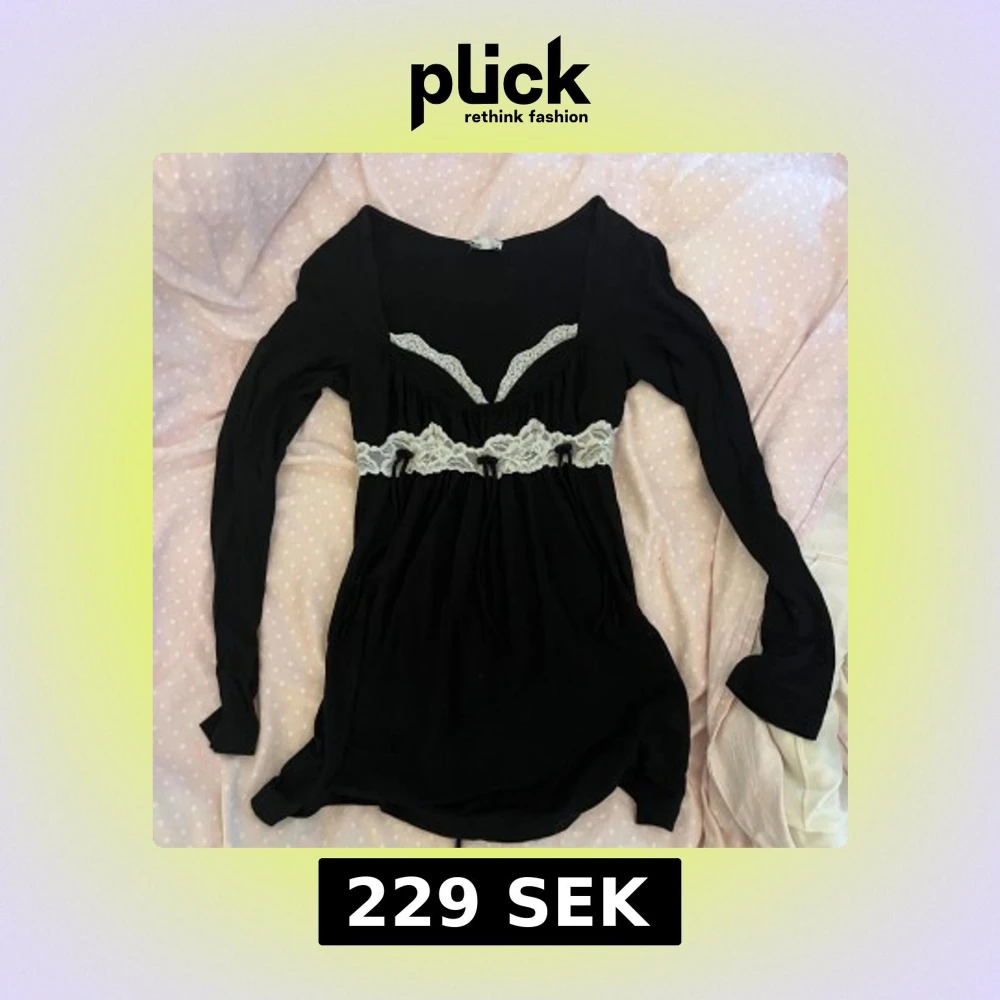 Säljer en svart tröja med lång ärm och vit spets vid byst och midja. tröjan har en djup v-ringning och fina knytband under spetsen. Mjuk och skön, perfekt för dig som gillar romantiska detaljer och kontraster.