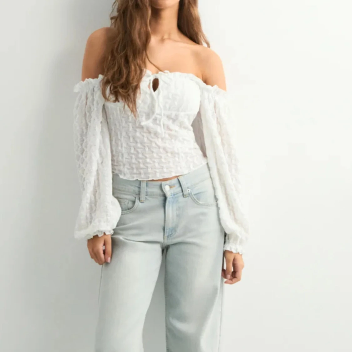 Supersöt vit blus med offshoulder och långa puffärmar. Toppen har ett diskret strukturmönster, knytning framtill och smockad resår vid ärmslut och axlar. Perfekt för en trendig och romantisk look. Säljer då den aldrig kommit till användning! Säljs inte längre