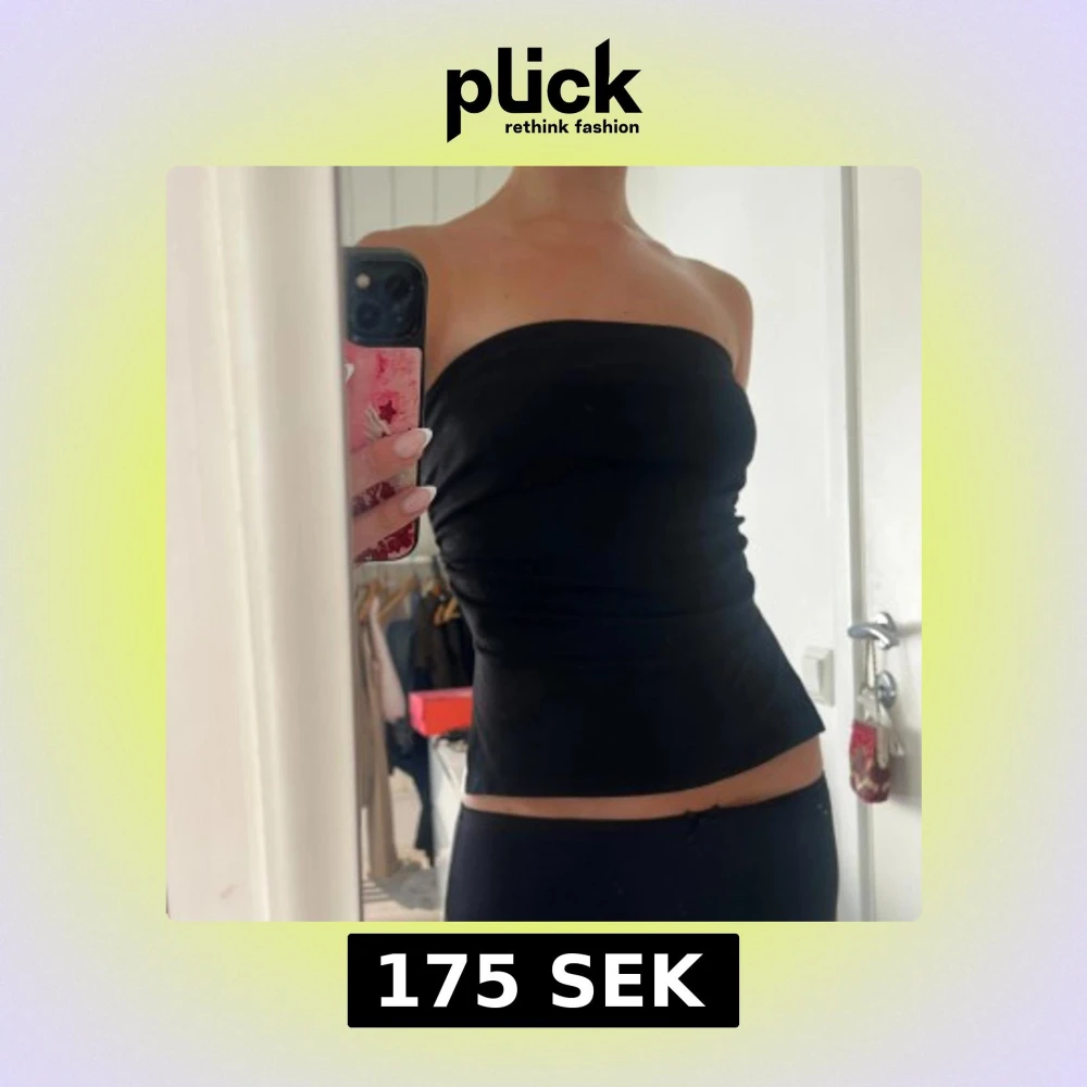 Säljer en svart bandeau tubtopp med tight passform och snygg slits på sidan. Toppen är axelbandslös och sitter smickrande mot kroppen, perfekt för dig som gillar minimalistisk stil. Enkel att matcha med både jeans och kjol.