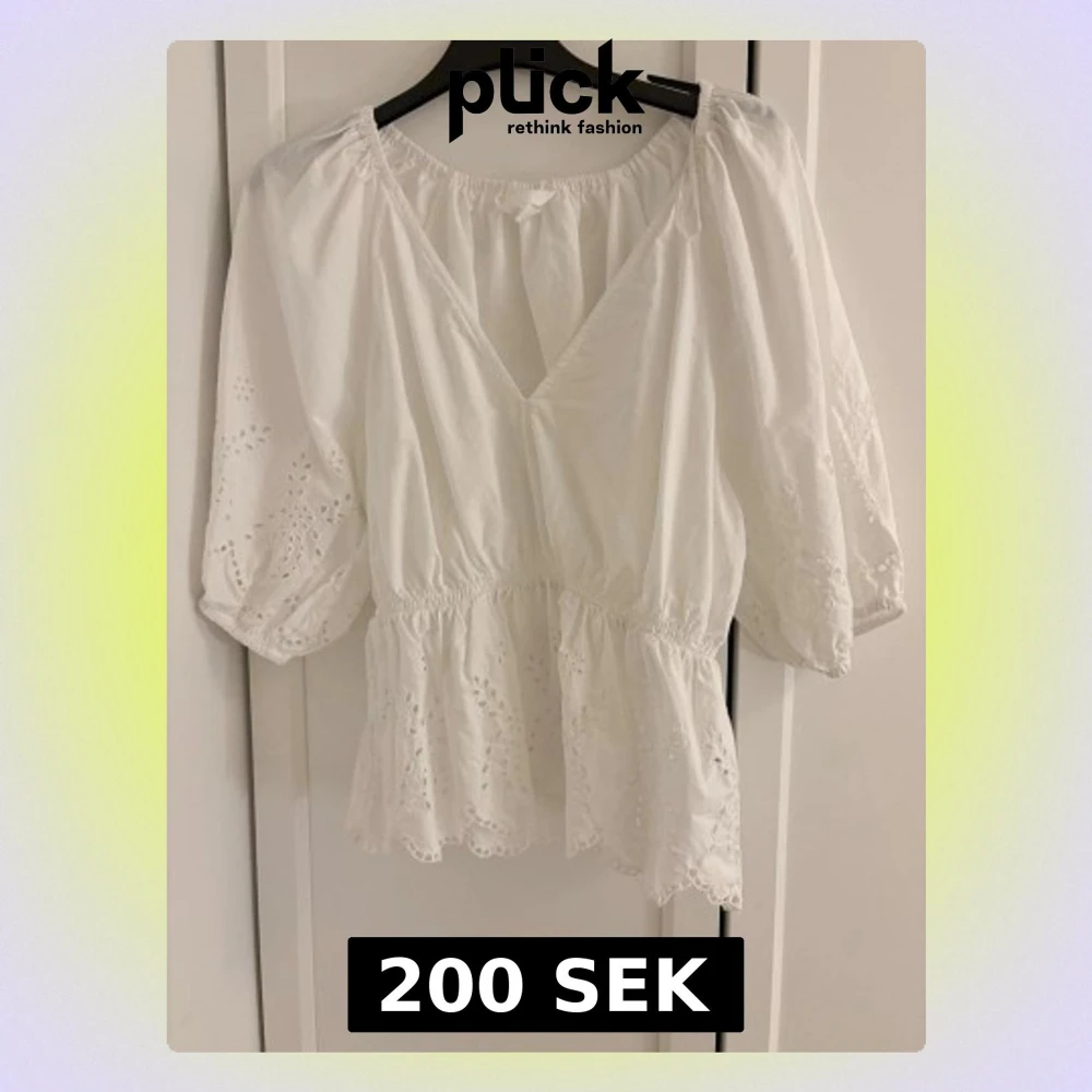 Söt vit blus med v-ringning och broderade hålbroderier på ärmar och nederkant. Blusen har puffiga korta ärmar och en volang nedtill som ger en romantisk känsla. Perfekt till jeans eller kjol för en fräsch look.