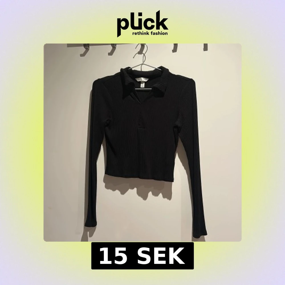 Svart croppad polotopp med långa ärmar och krage. Toppen är ribbad och har en snygg v-ringning framtill. Perfekt för dig som gillar stilrena och trendiga plagg med lite edge.