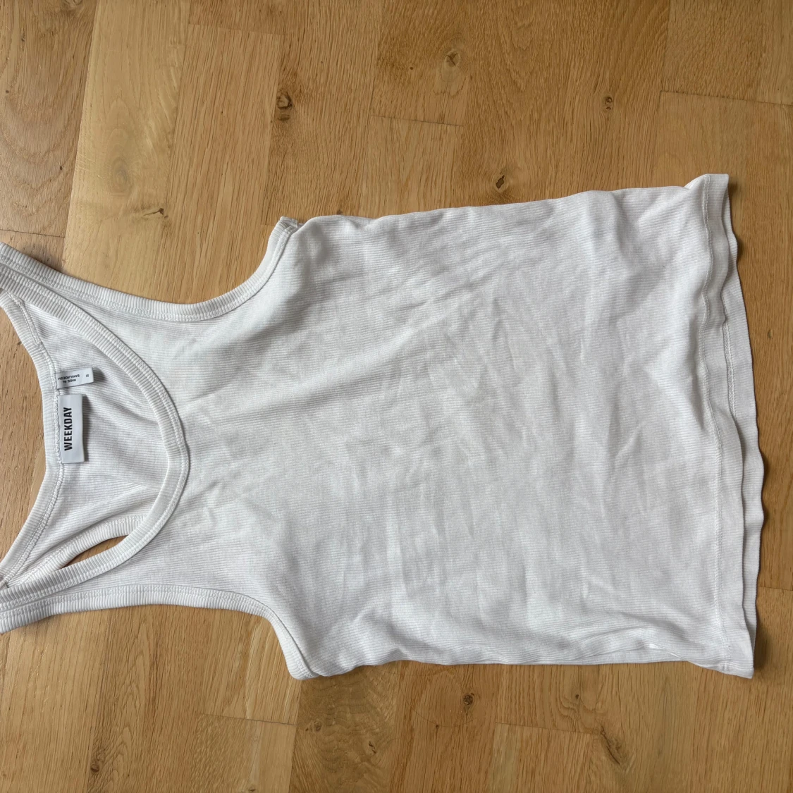 Säljer en klassisk vit ribbad linnetopp från Weekday. Modellen är ärmlös med rund halsringning och tight passform. Perfekt att styla med jeans eller kjol för en clean och enkel look. Materialet är mjuk bomull som känns skönt mot huden.